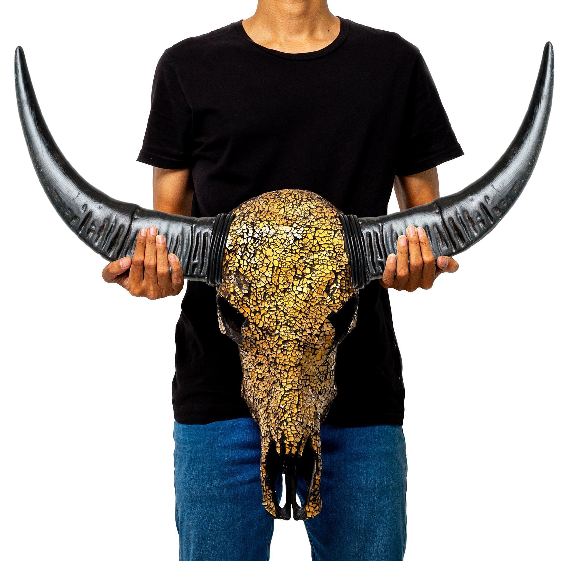 In a process that can take days, this skull is expertly crafted by attaching unique pieces of radiant, golden tile to an authentic, blackened skull. No two pieces are alike, and Balinese artisans draw on years of experience to create such a high-quality art piece. The mosaic finish has a depth to it like no other - there is nothing quite like it out there.