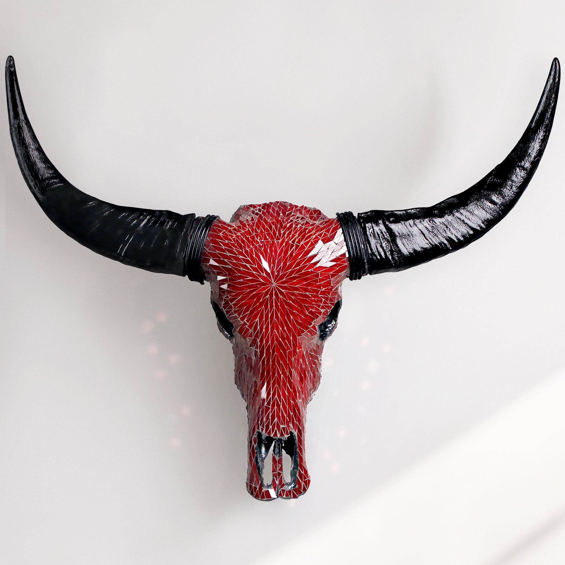 Embrace the element of chance with our mesmerizing Buffalo Skull - Red Mirror // Mosaic Finish. This jaw-dropping home decor blends both the organic influence of natural skulls with the modern allure of red mosaic. This is a premium piece like no other.