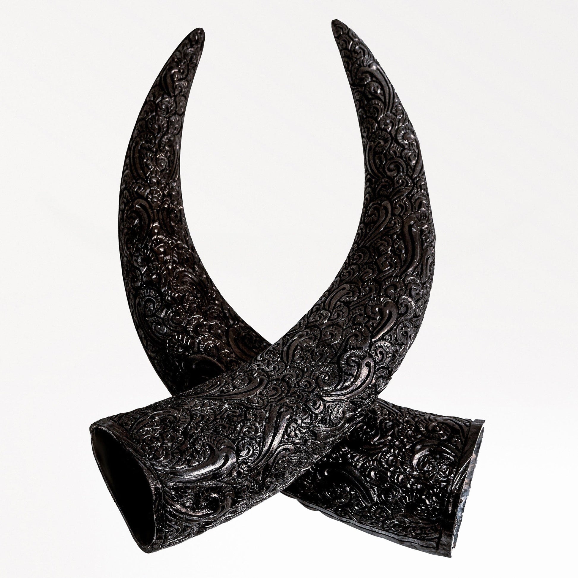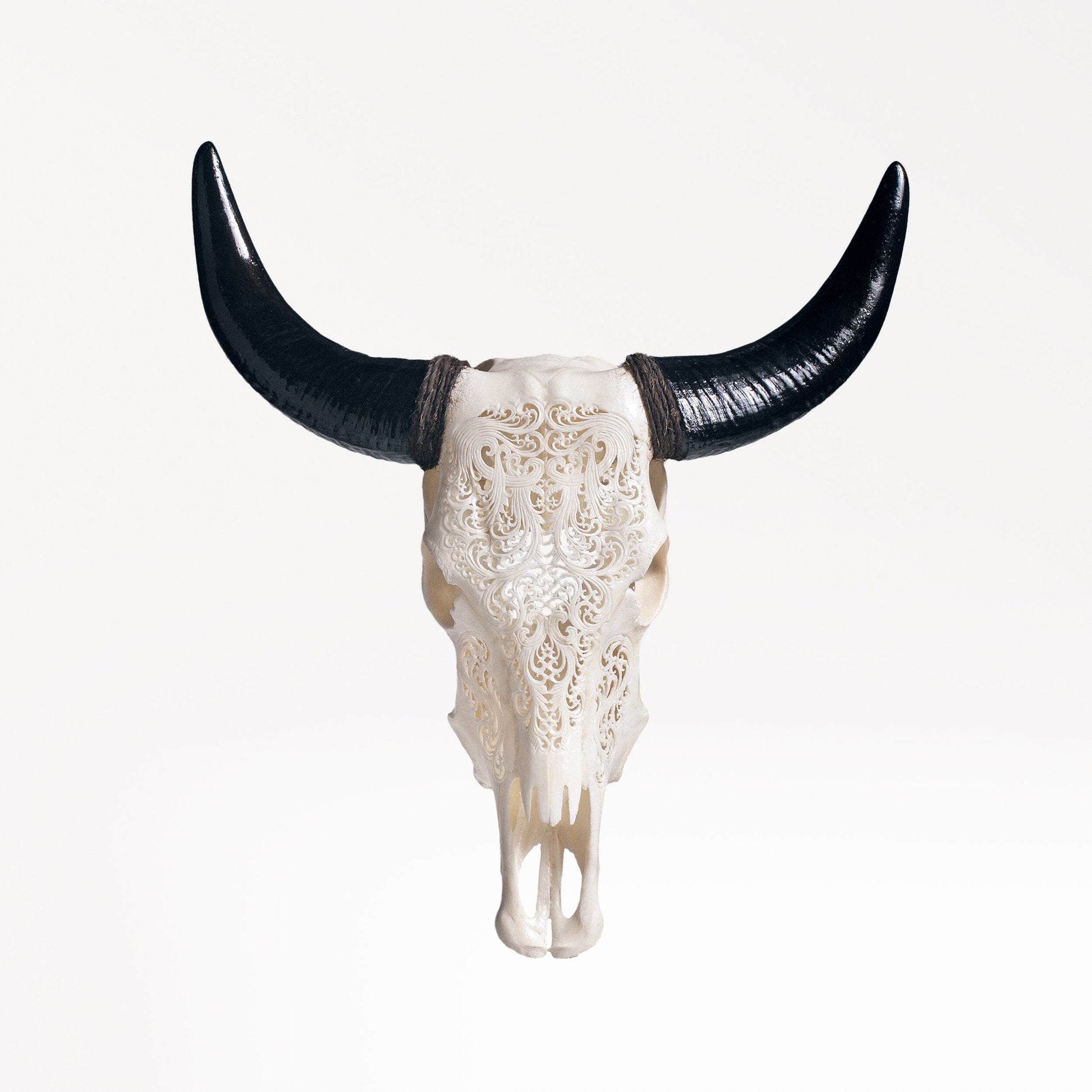 The might of sacred oceans is channeled with our Hand Carved Cow Skull - White Titan. Flowing wave designs and a majestic skull create a contrast between the fluidity of life and the inevitability of death. The natural white tones are perfectly complemented by the bold horns, making this a piece of decor that will add a finishing touch to your stylish home.