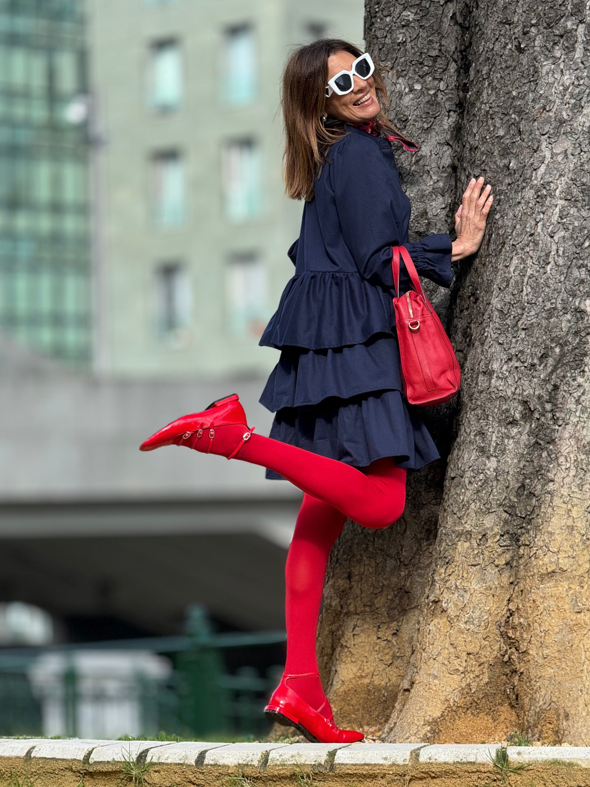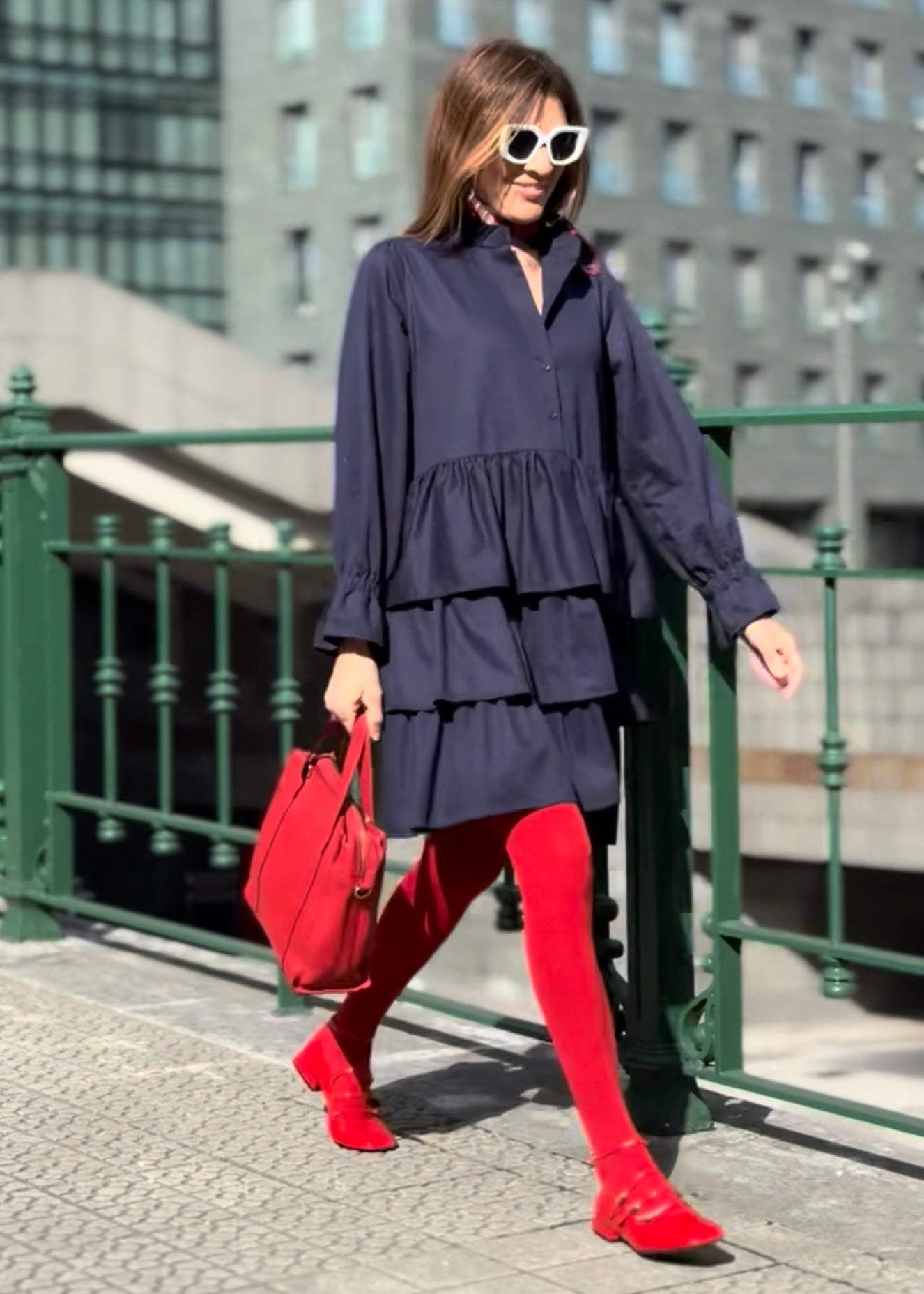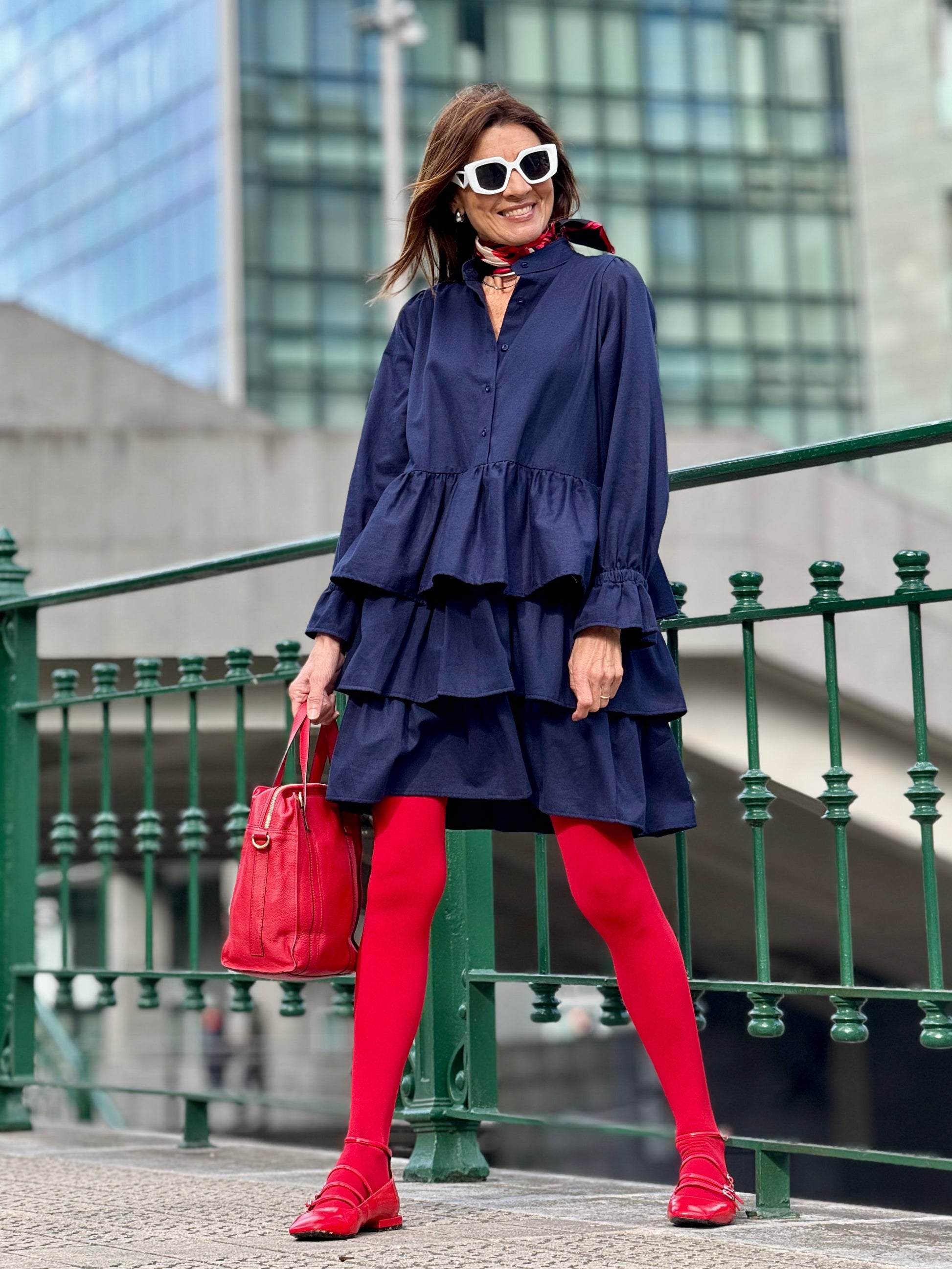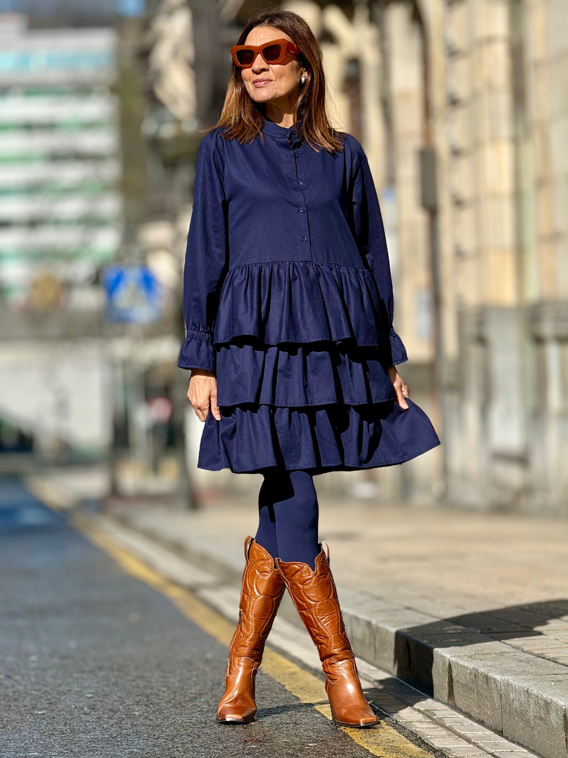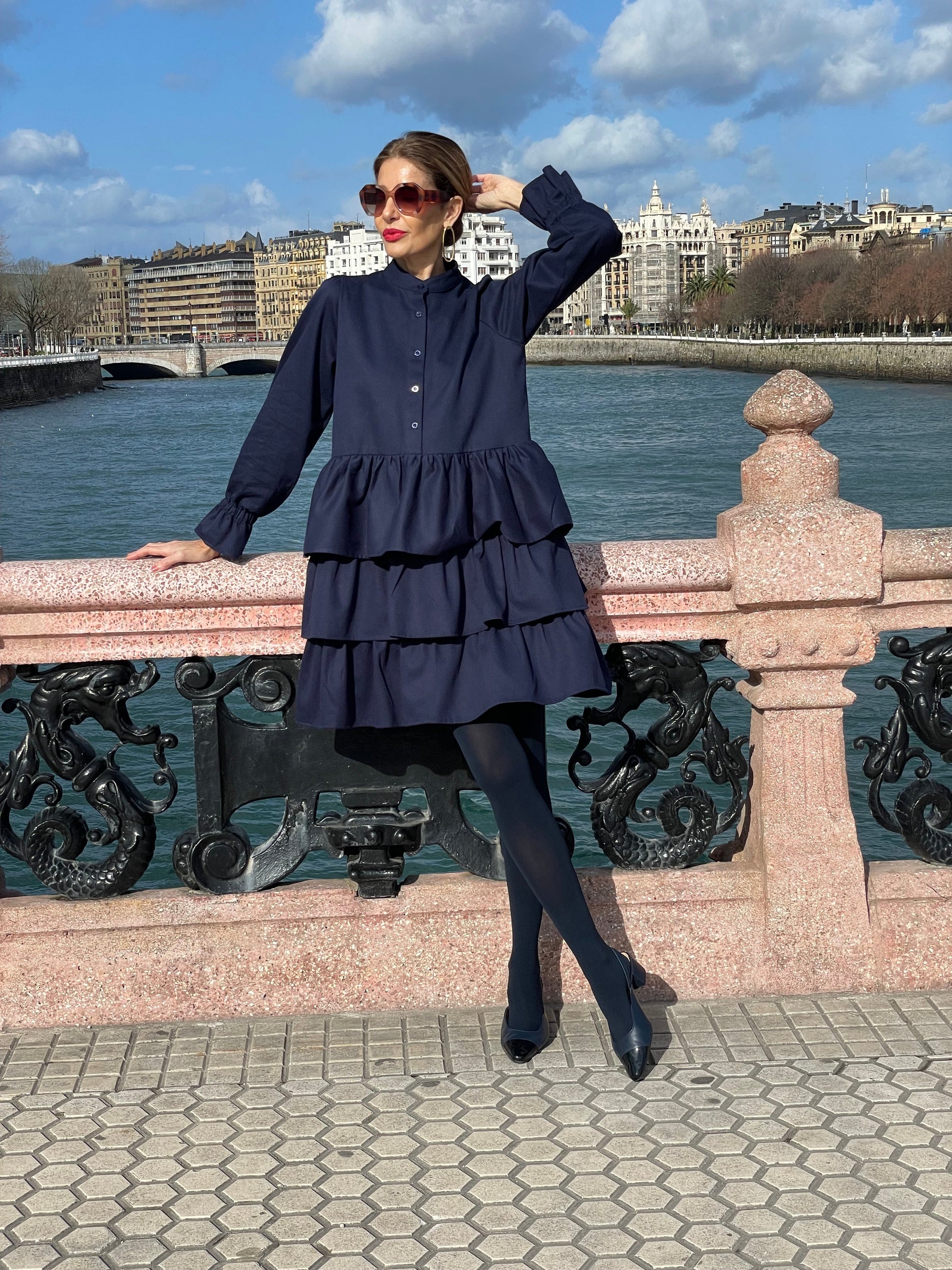 Introducing the stunning Dress Alexandra in navy blue! Made from high-quality gabardine fabric, this dress features beautiful volants that add a touch of elegance and movement. Perfect for any occasion, this dress will make you feel confident and stylish. Elevate your wardrobe with this must-have piece!Lenght of the dress 89 cm.