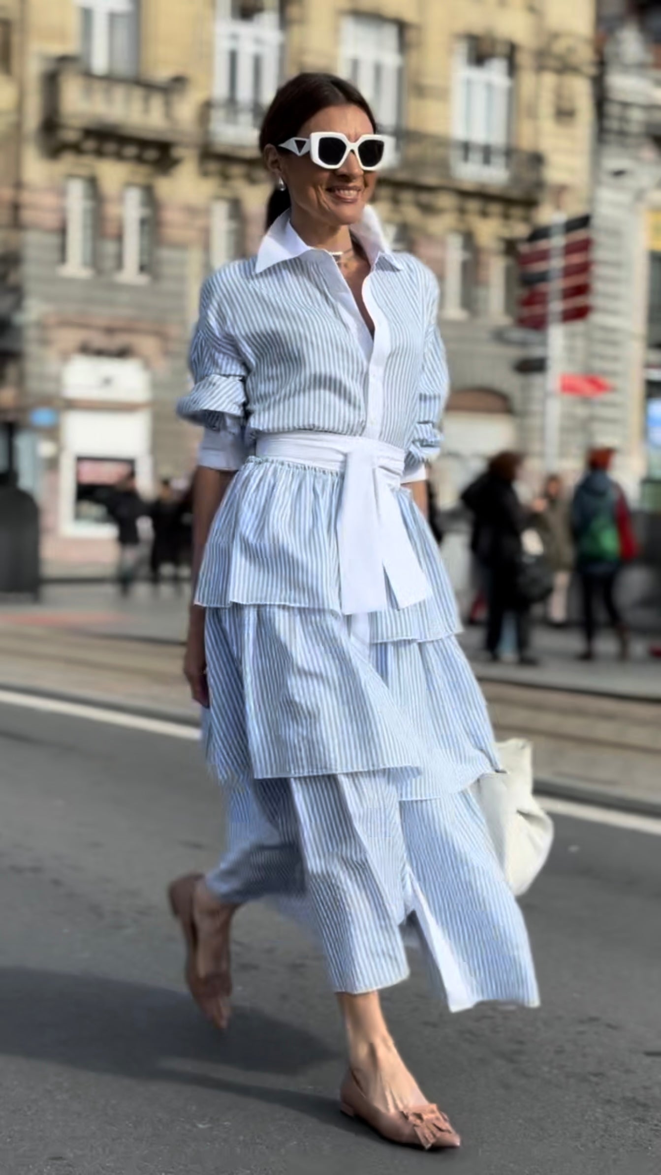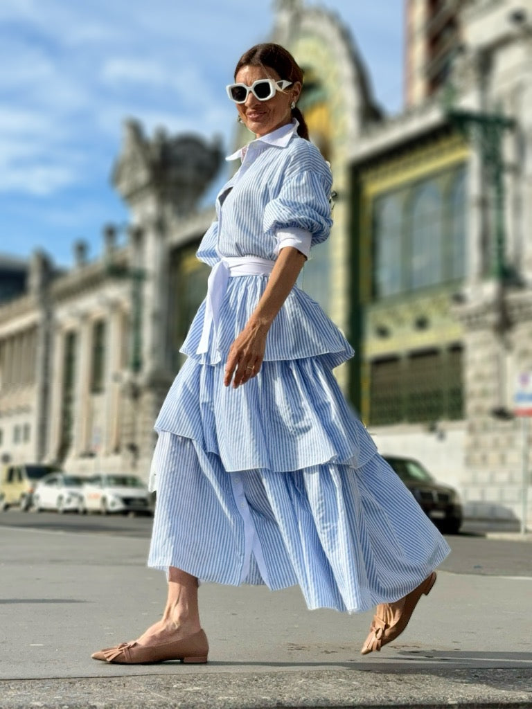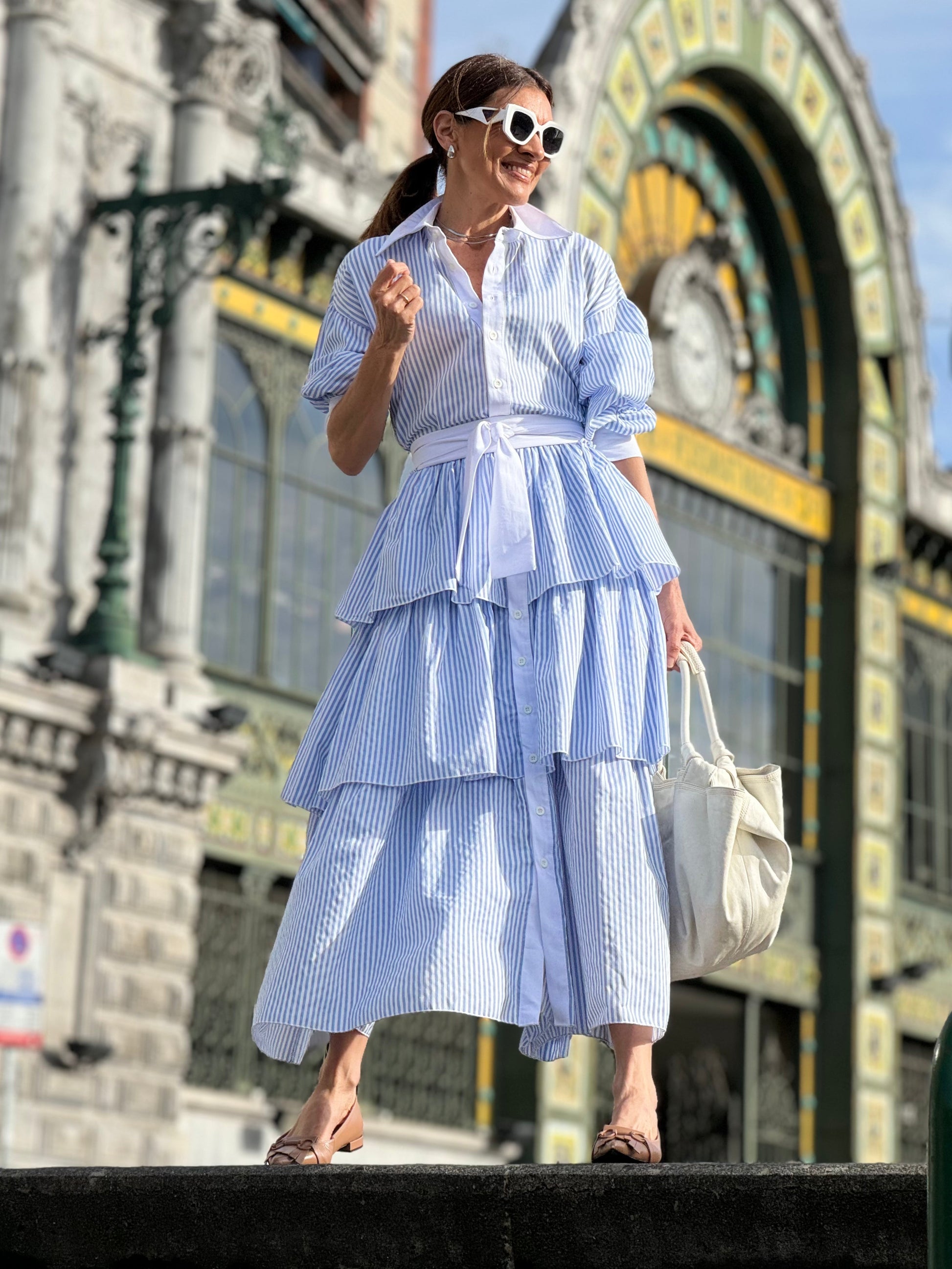 "Channel your inner fashionista with the Dress Brittany Stripes Blue. Made with premium Egyptian cotton, this blue and white striped dress offers both style and comfort. The extra fabric belt adds a touch of versatility, while the volant design adds a playful flair. Perfect for any occasion, this dress is a must-have for your wardrobe!"With a one size fits all design, the dress is suitable for a range of sizes from 34 to 42 in the German size system (see: tab sizes)Use machine wash at 30 degrees for easy care and maintenance.