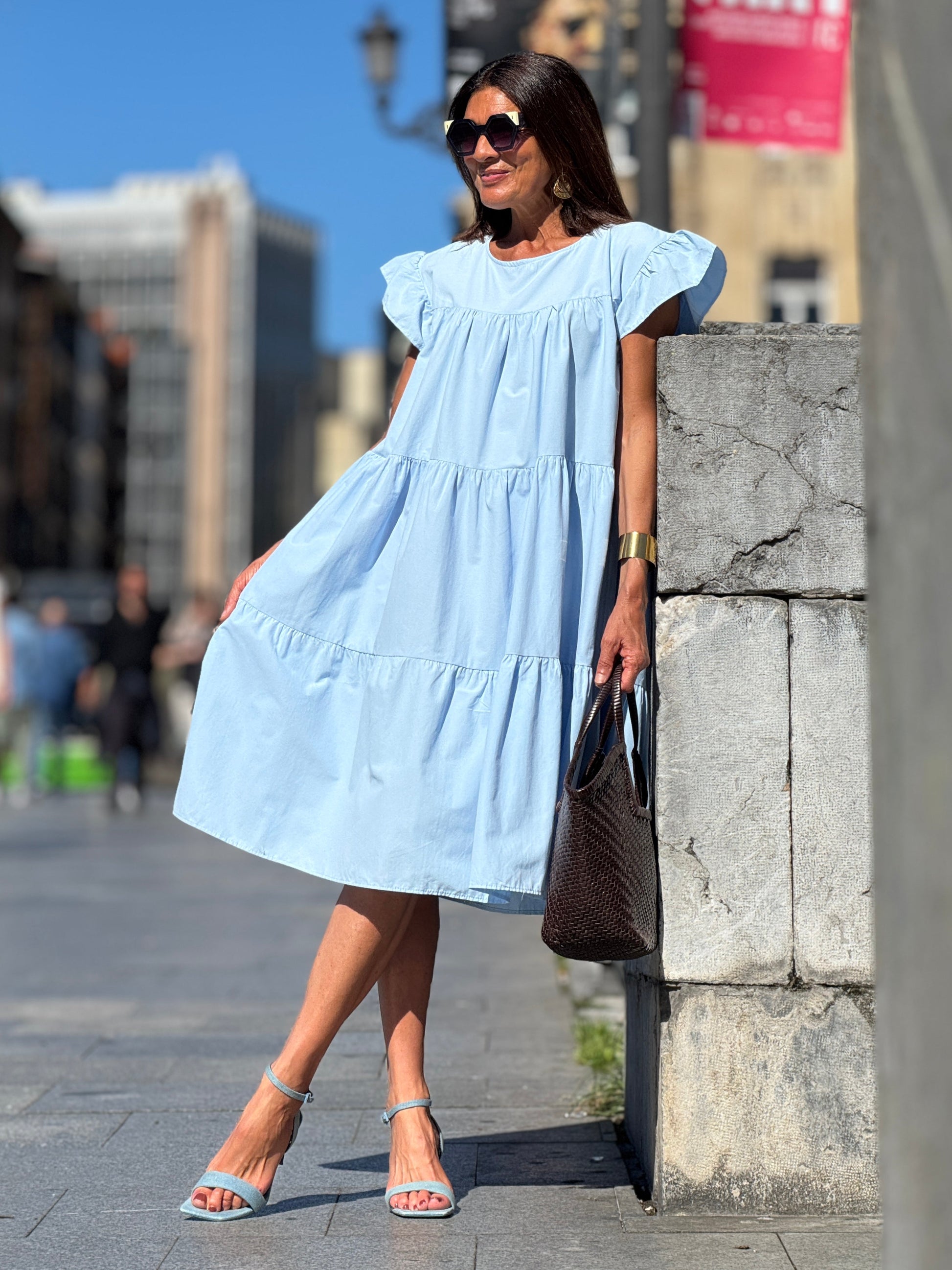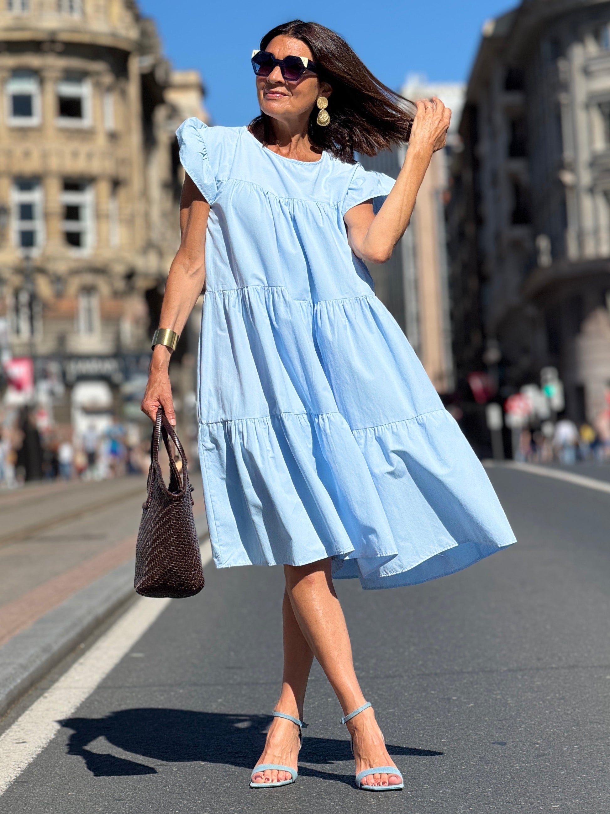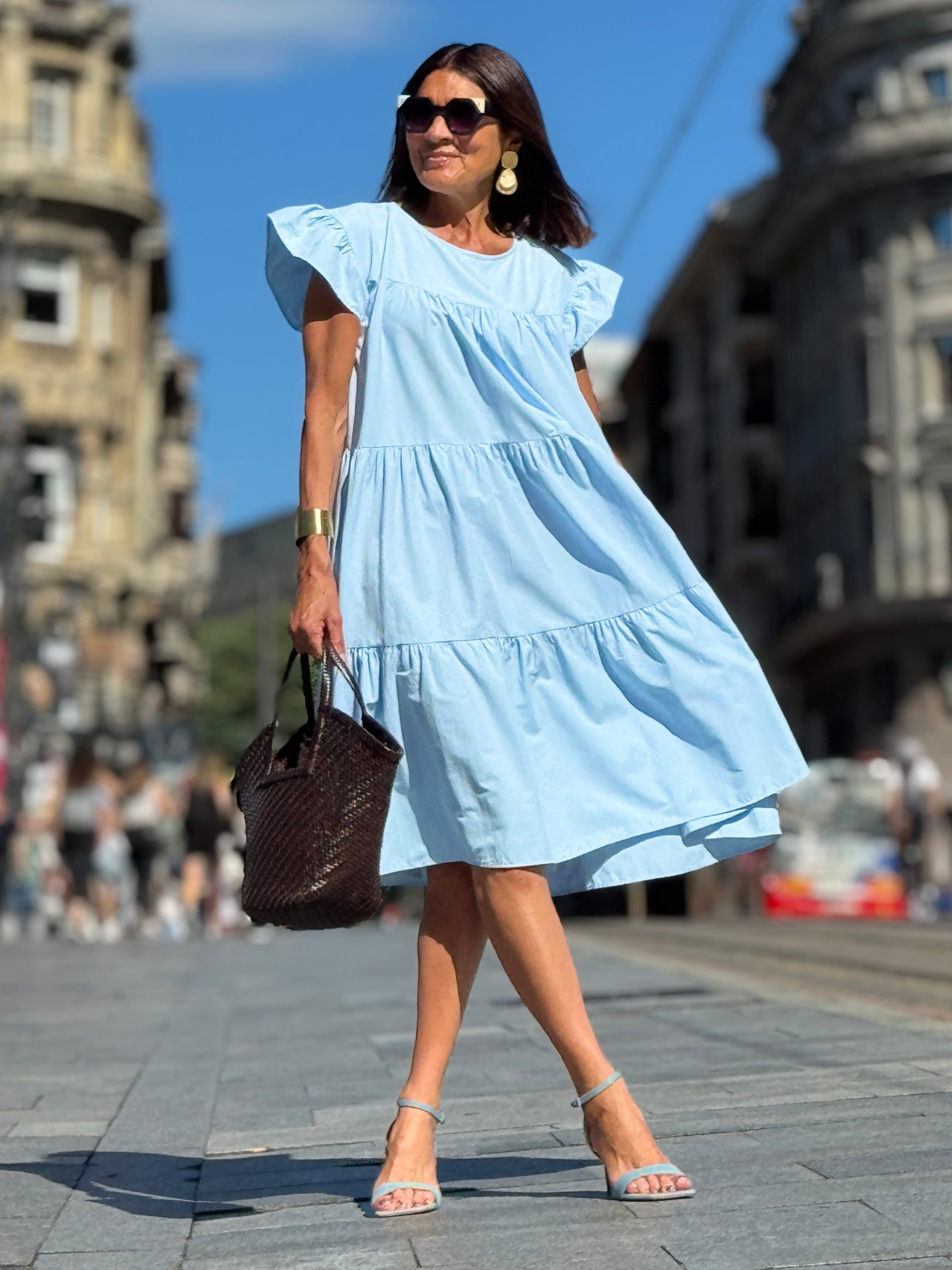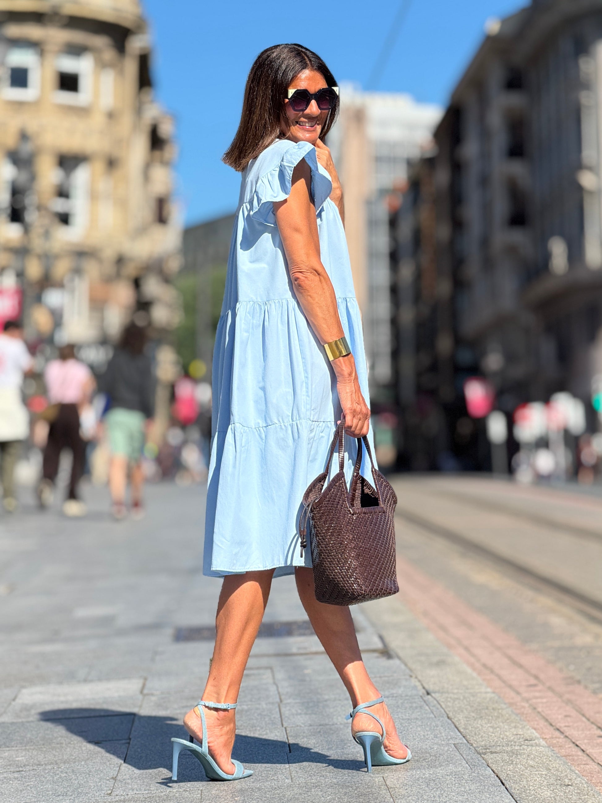 Stay stylish and comfortable all day with the Dress Caro Light Blue, a must-have piece made with luxurious 100% Egyptian cotton. This dress, designed by Marielle Stokkelaar, features a one size fits all design that fits till sizes 44 German, 16 UK, and 12 USA perfectly. The Dress Caro also looks great on smaller frames, with a length that is also ideal for around 160 cm.