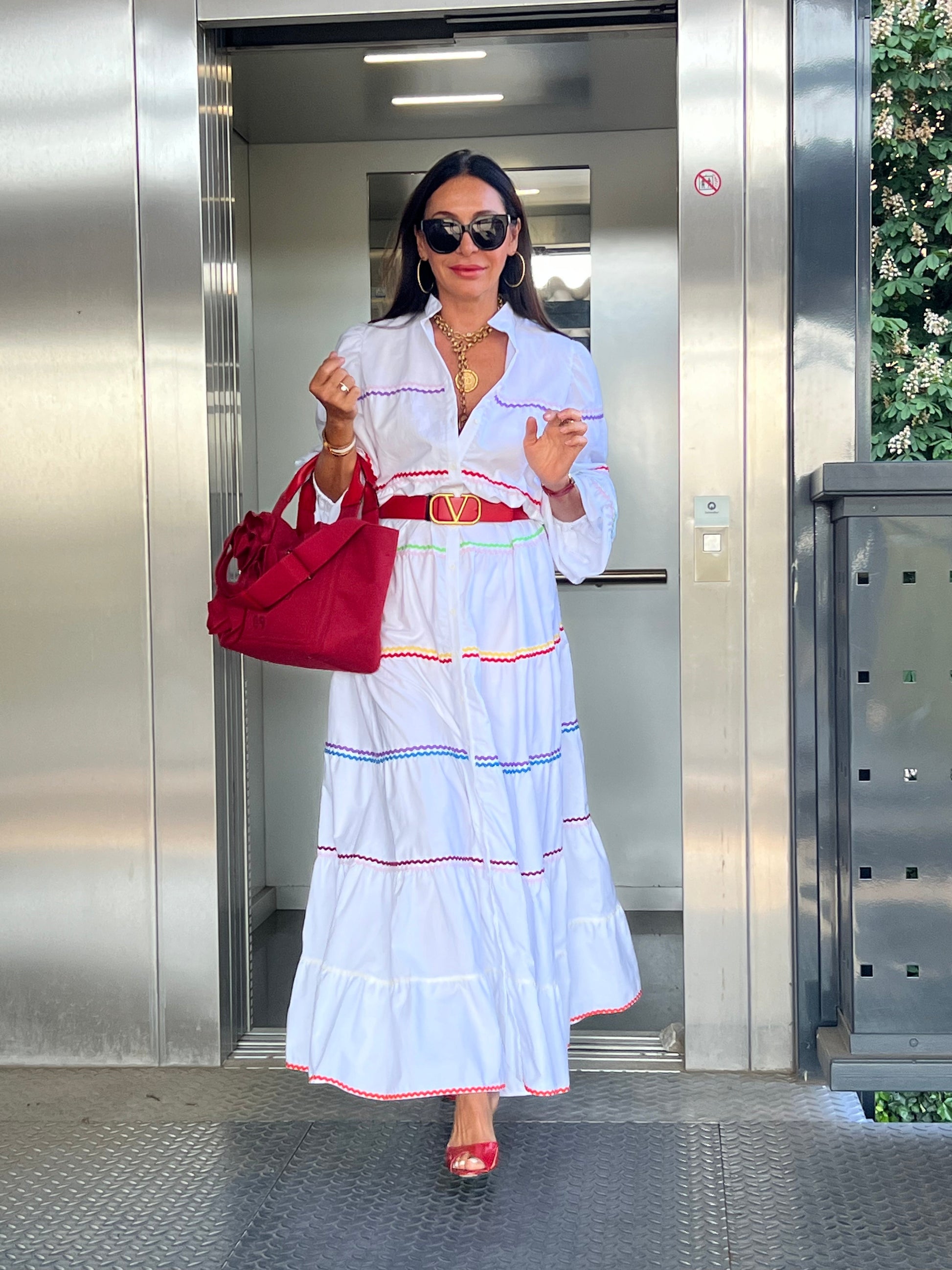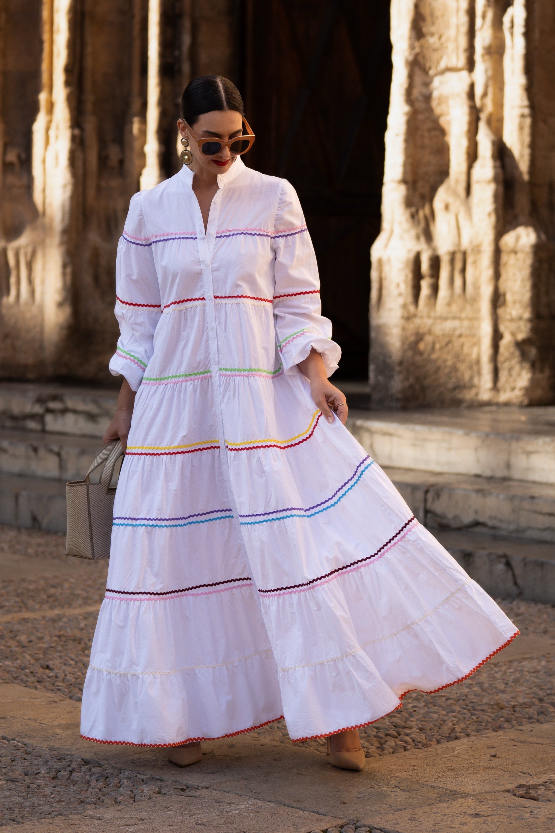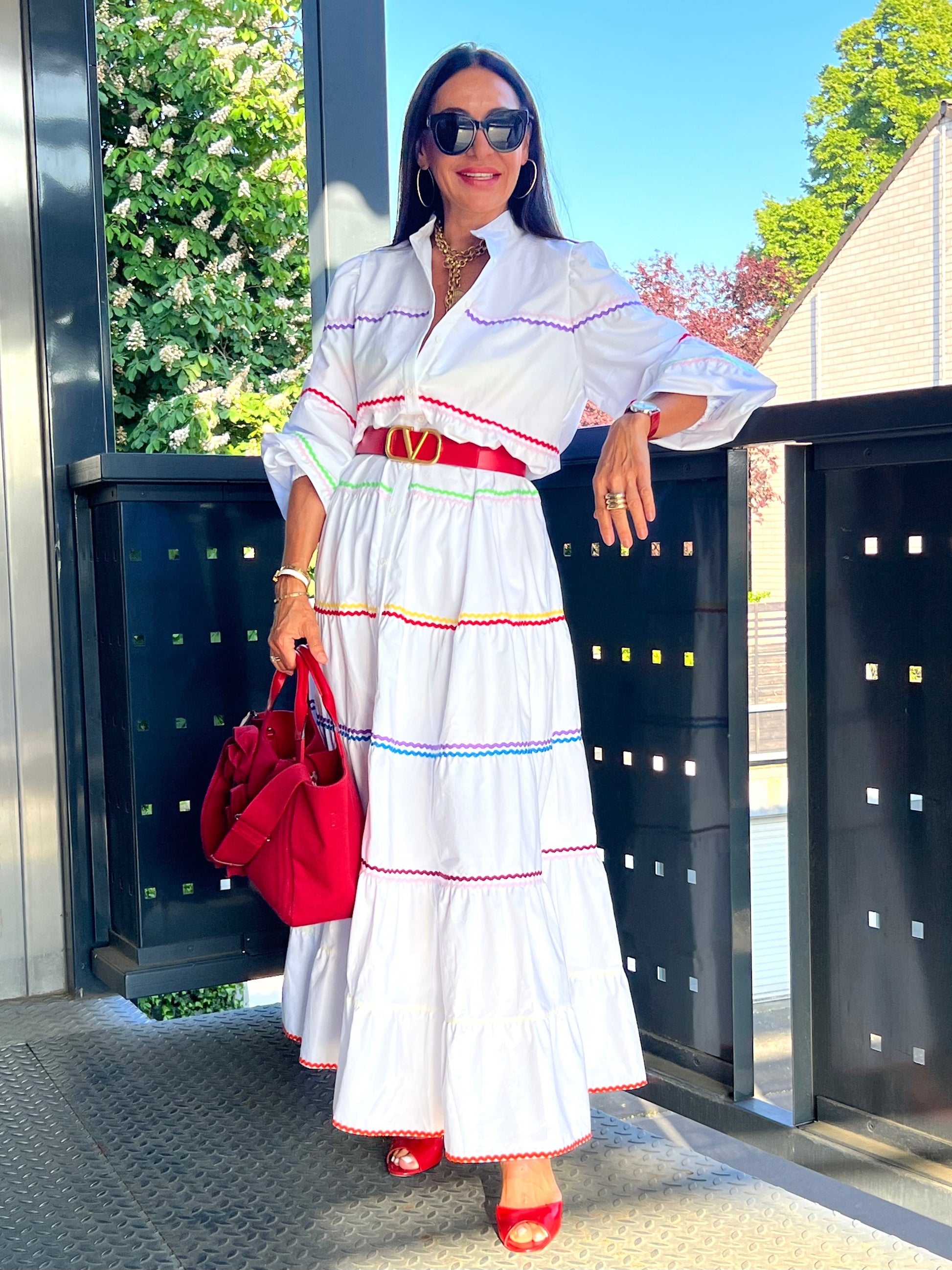 The Clementine White Dress is a stylish and comfortable one size fits all dress from MARIELLE STOKKELAAR. Made from 100% Egyptian cotton with colour accents it is suitable till sizes 42 German, 14 UK, and 10 USA. The length of the dress is 136 cm, but it can be shortened if needed.Dress Clementine White has side pockets.