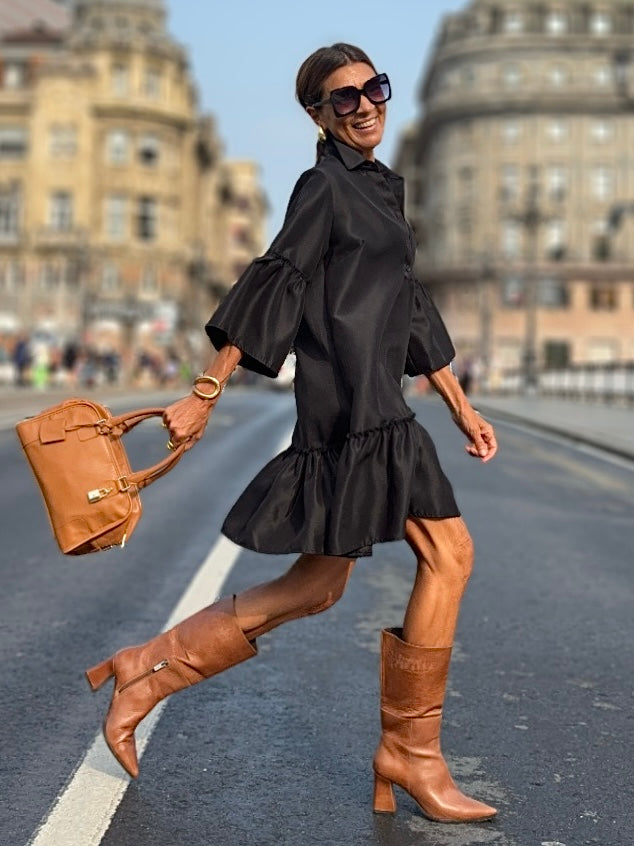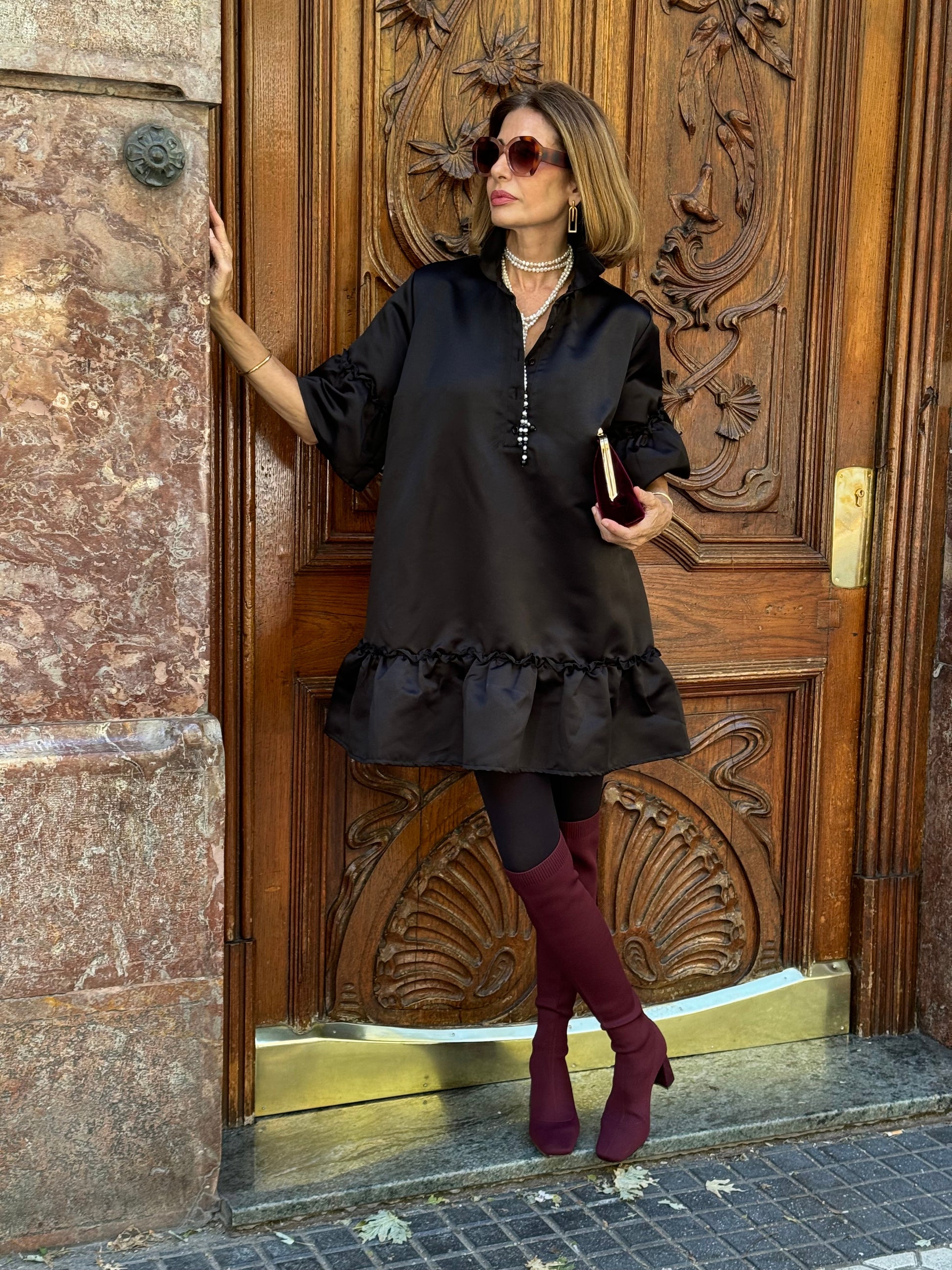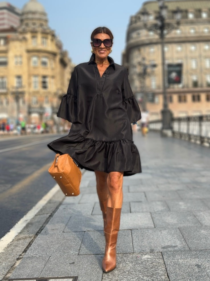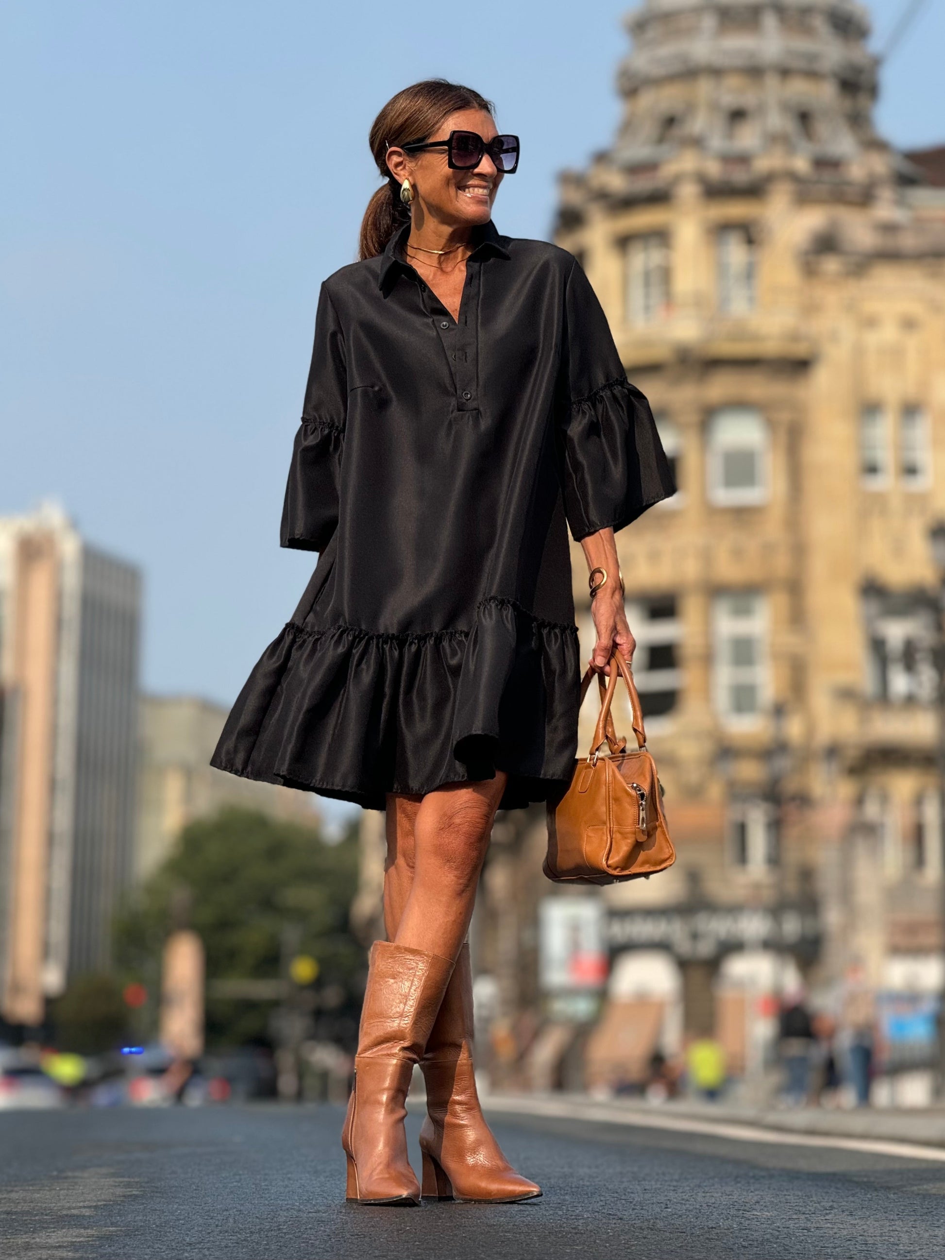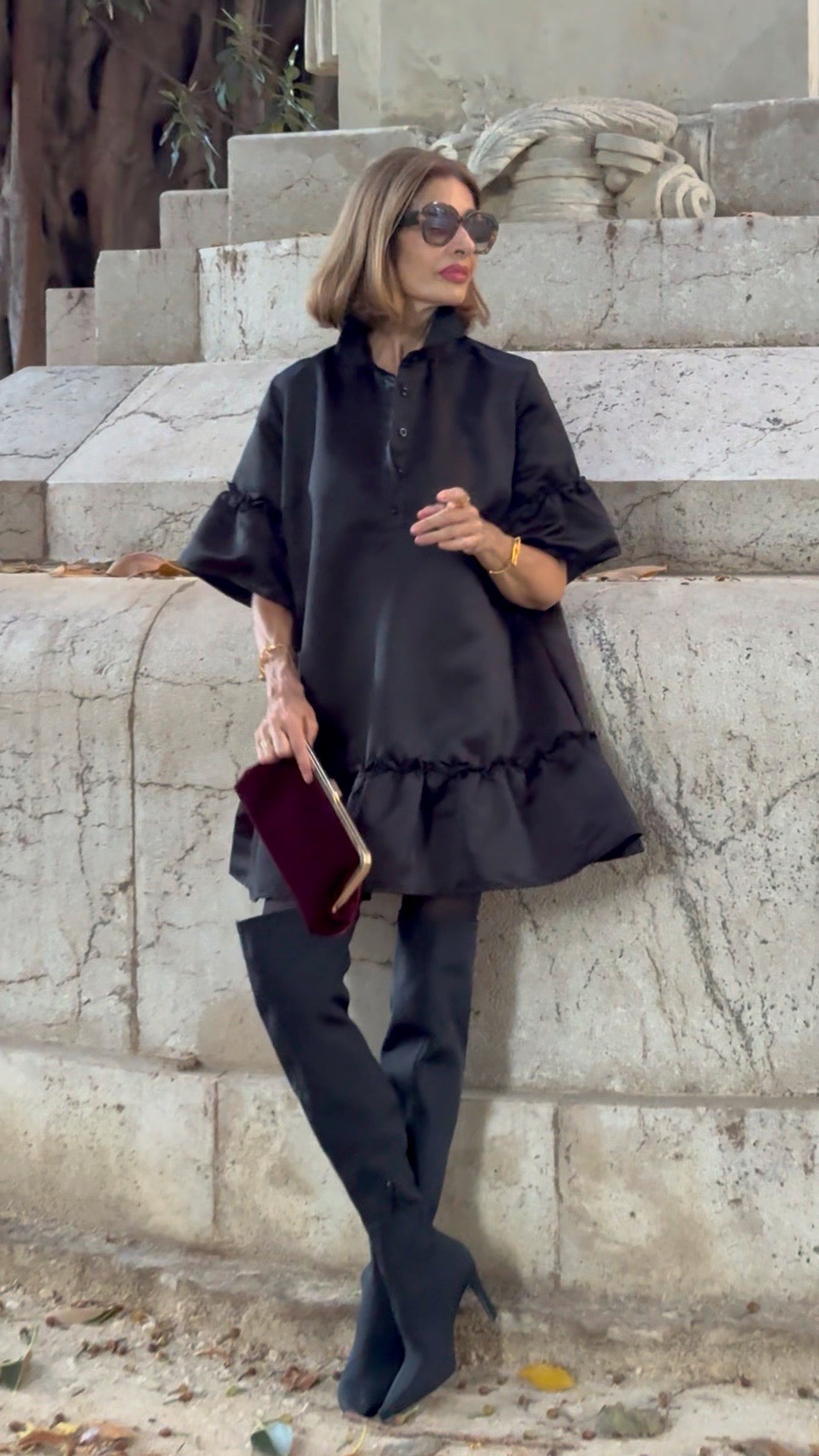 The Florentine Dress is a stunning and unique piece that will surely turn heads. This high-quality dress features a beautiful design, complete with a luxurious black colour for a touch of sophistication. Its relaxed fit ensures maximum comfort, making it perfect for any special occasion, whether it be a fancy event or just to make a statement. Look your best and make an impression with the Florentine Dress.Dress Florentine Black has side pockets. Length 91 cm/ 2.99 ft