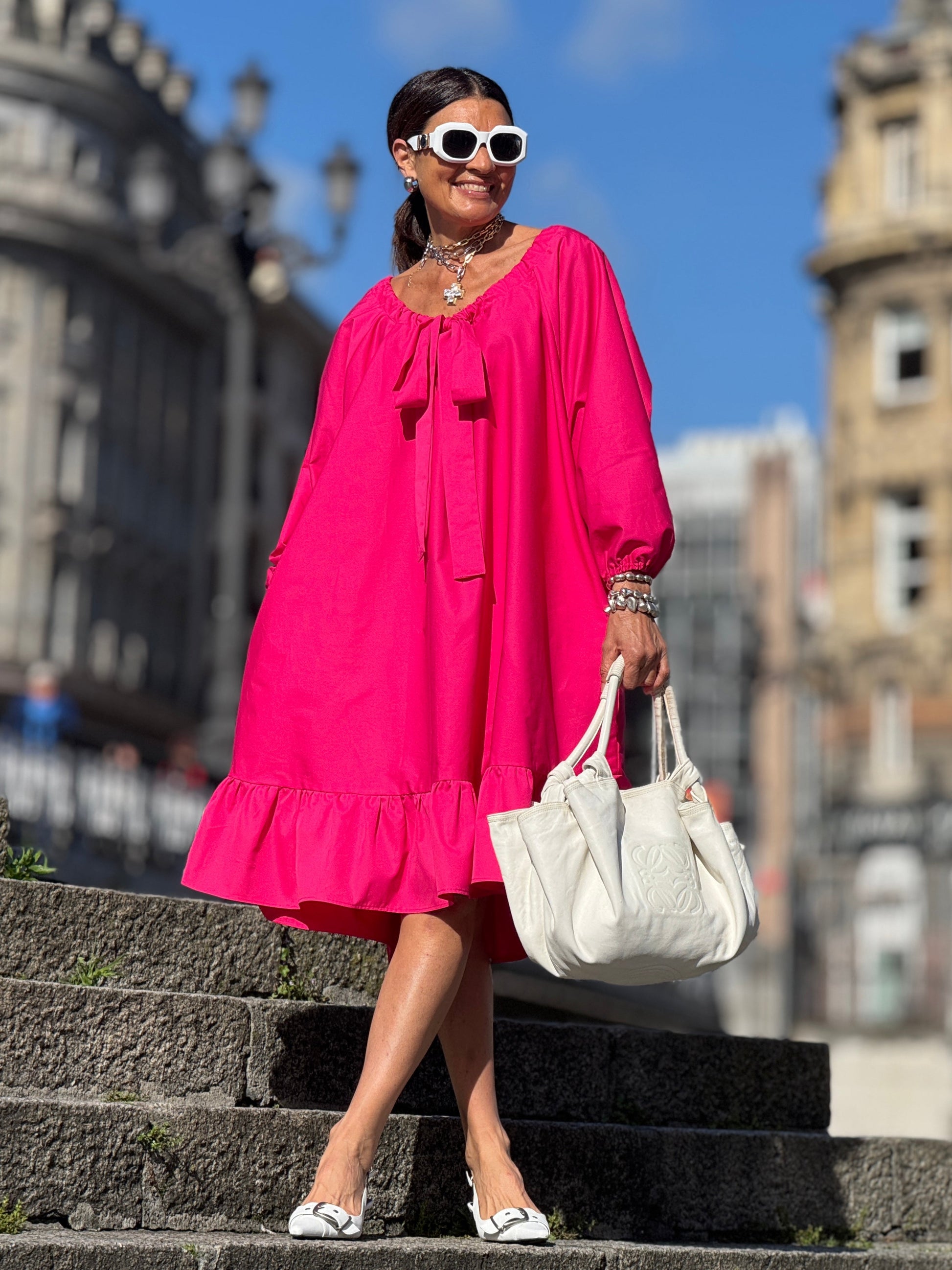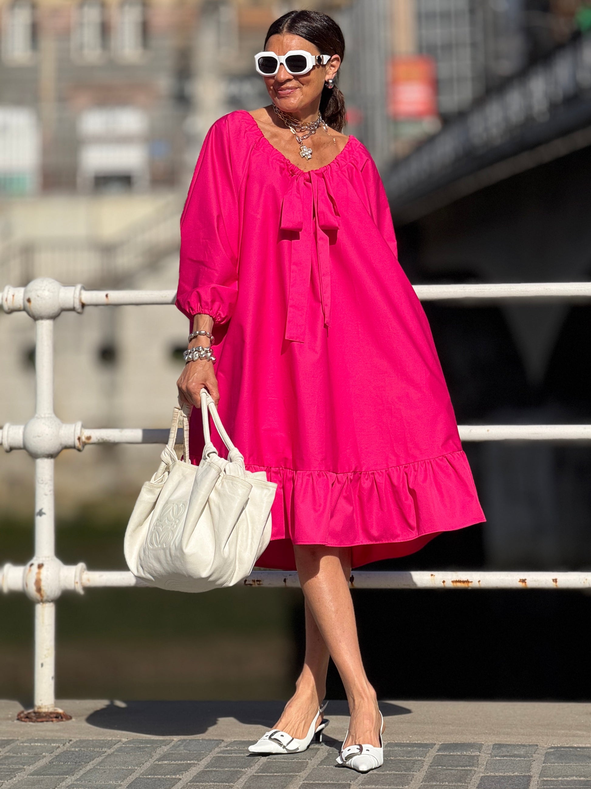 The Dress Ivy Fuchsia is a stylish and comfortable garment made from 100% Egyptian cotton. With a one size fits all design, this dress is suitable for a range of sizes from 34 to 42 in the German size system (see: tab sizes). Measuring a length of 100 cm. This dress is perfect for any occasion. Dress Ivy Fuchsia has side pockets. Use machine washes at 30 degrees for easy care and maintenance.