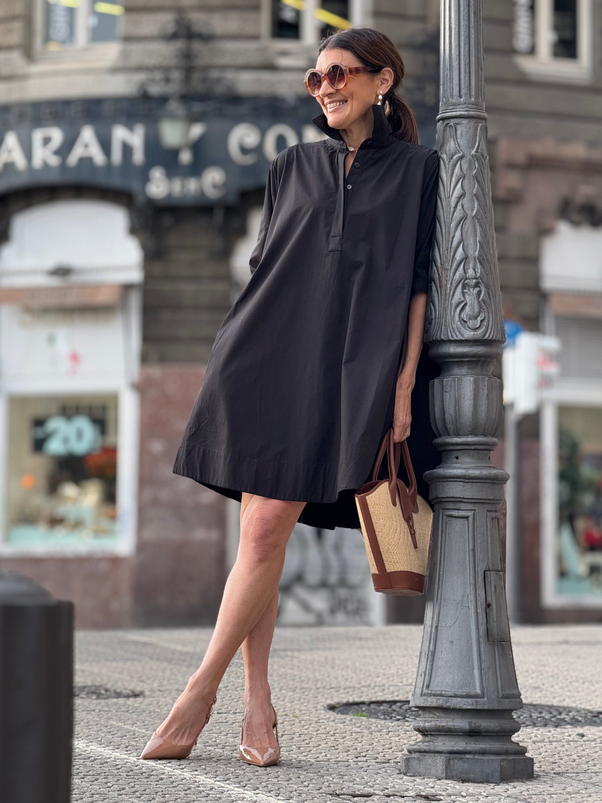 Take on new challenges in our Dress Laetitia Black! Made from 100% Egyptian cotton, this classic shirt dress adds a touch of luxury to your wardrobe. With its versatile style, you can take on any adventure in comfort and style. Elevate your look and conquer the day!Dress Laetitia Black has side pockets.