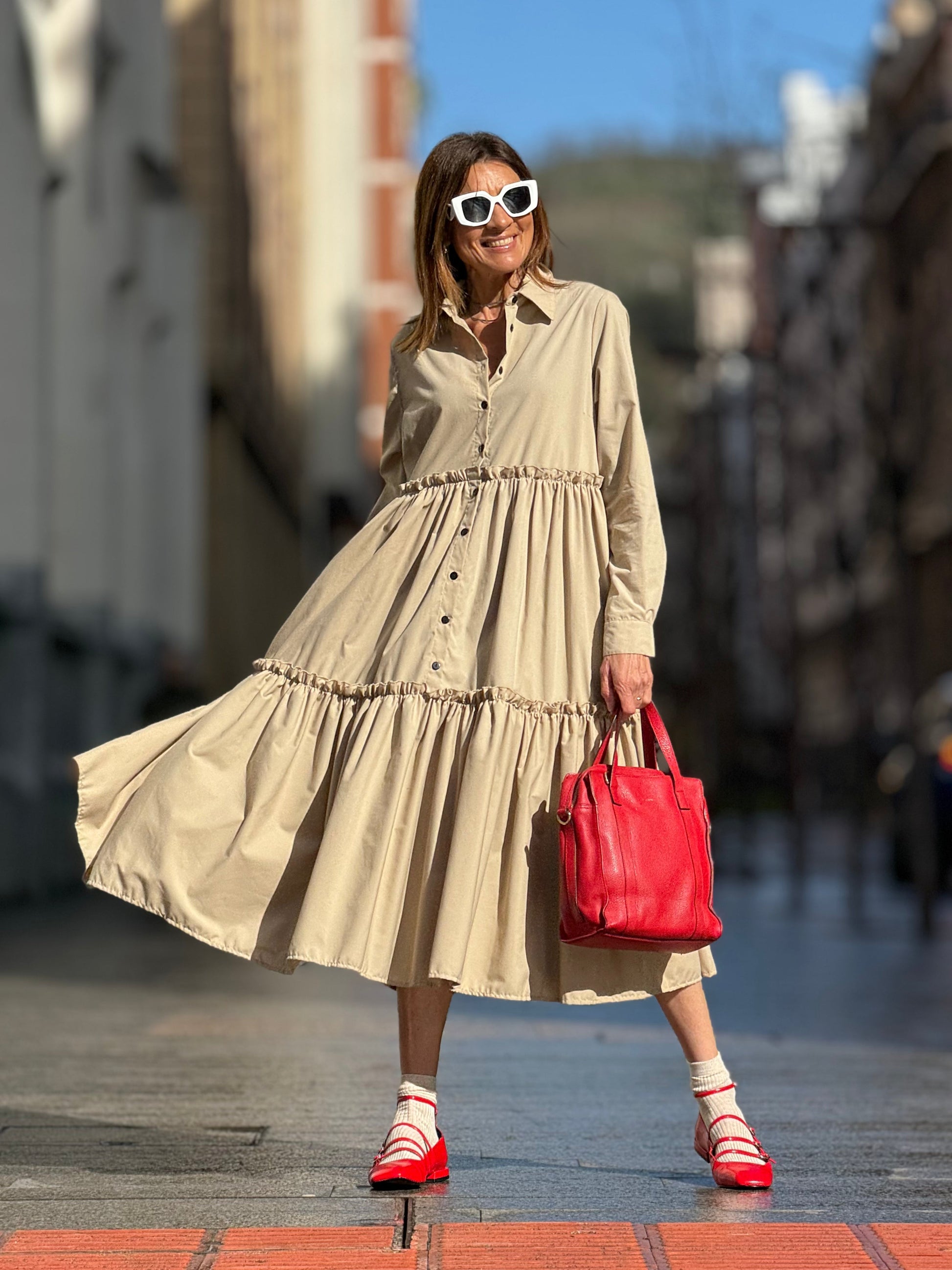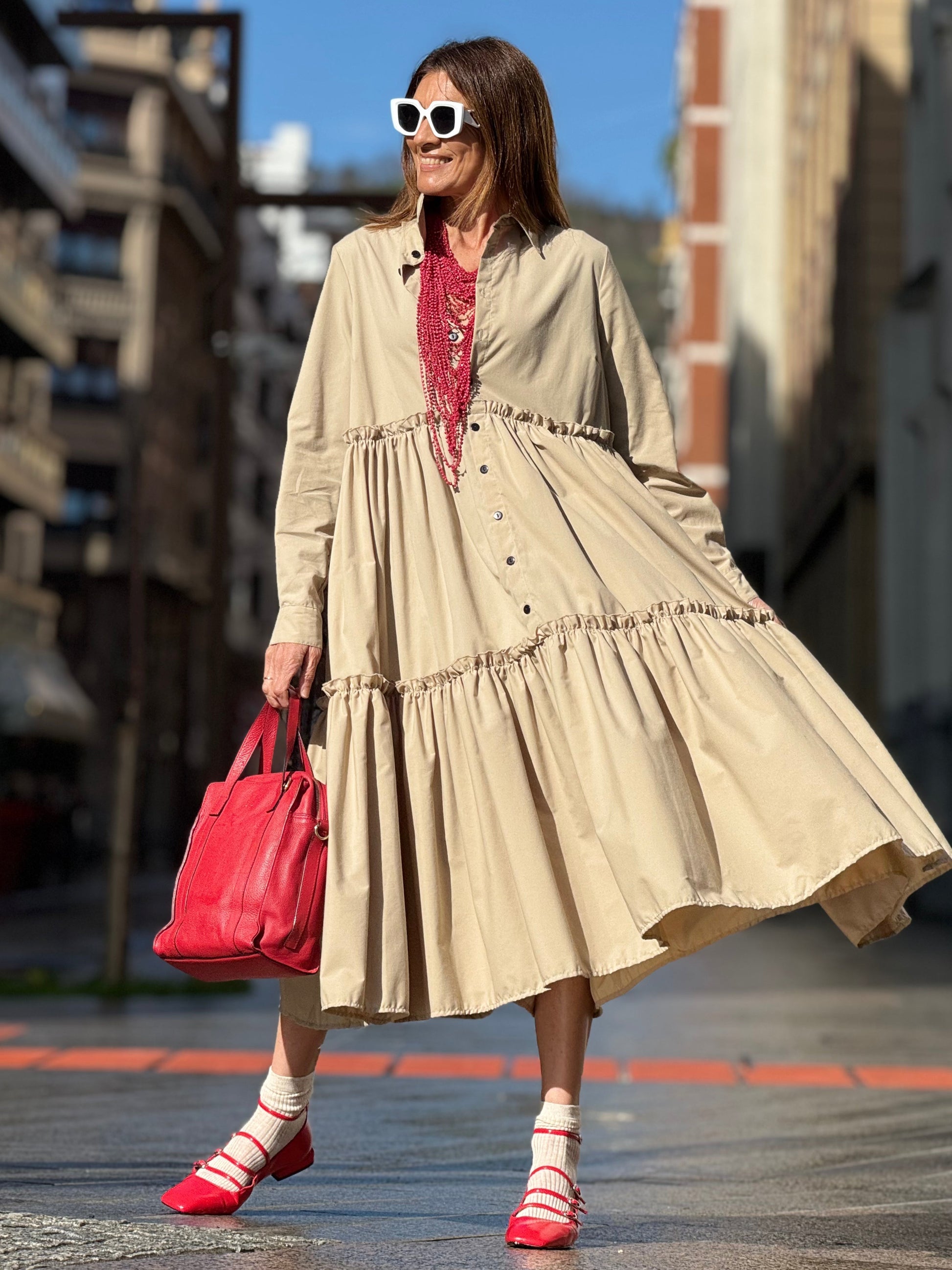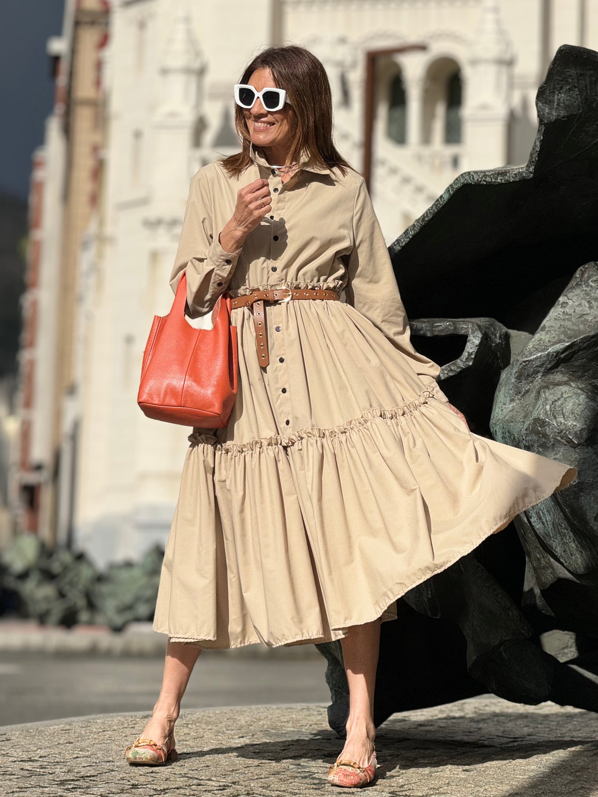 Introducing the Dress Marie Louise in beige - the perfect choice for both business and leisure. Made from high-quality Egyptian cotton, this dress offers a flawless fit while adding a touch of elegance to any occasion. Experience the luxurious feel and timeless style of this dress. With a one size fits all design, the dress is suitable for a range of sizes from 34 to 40 in the German size system (see: tab sizes) At the back the dress has an attached belt item. Use machine washes at 30 degrees for easy care and maintenance .