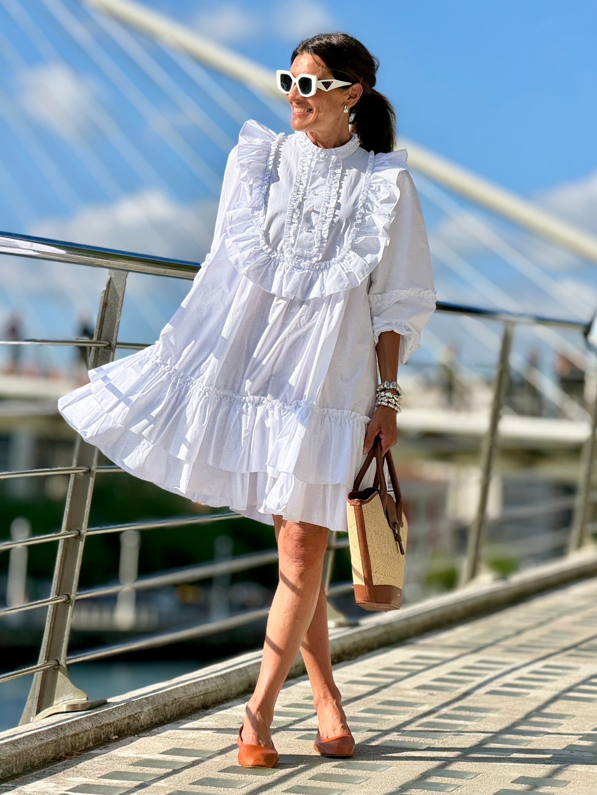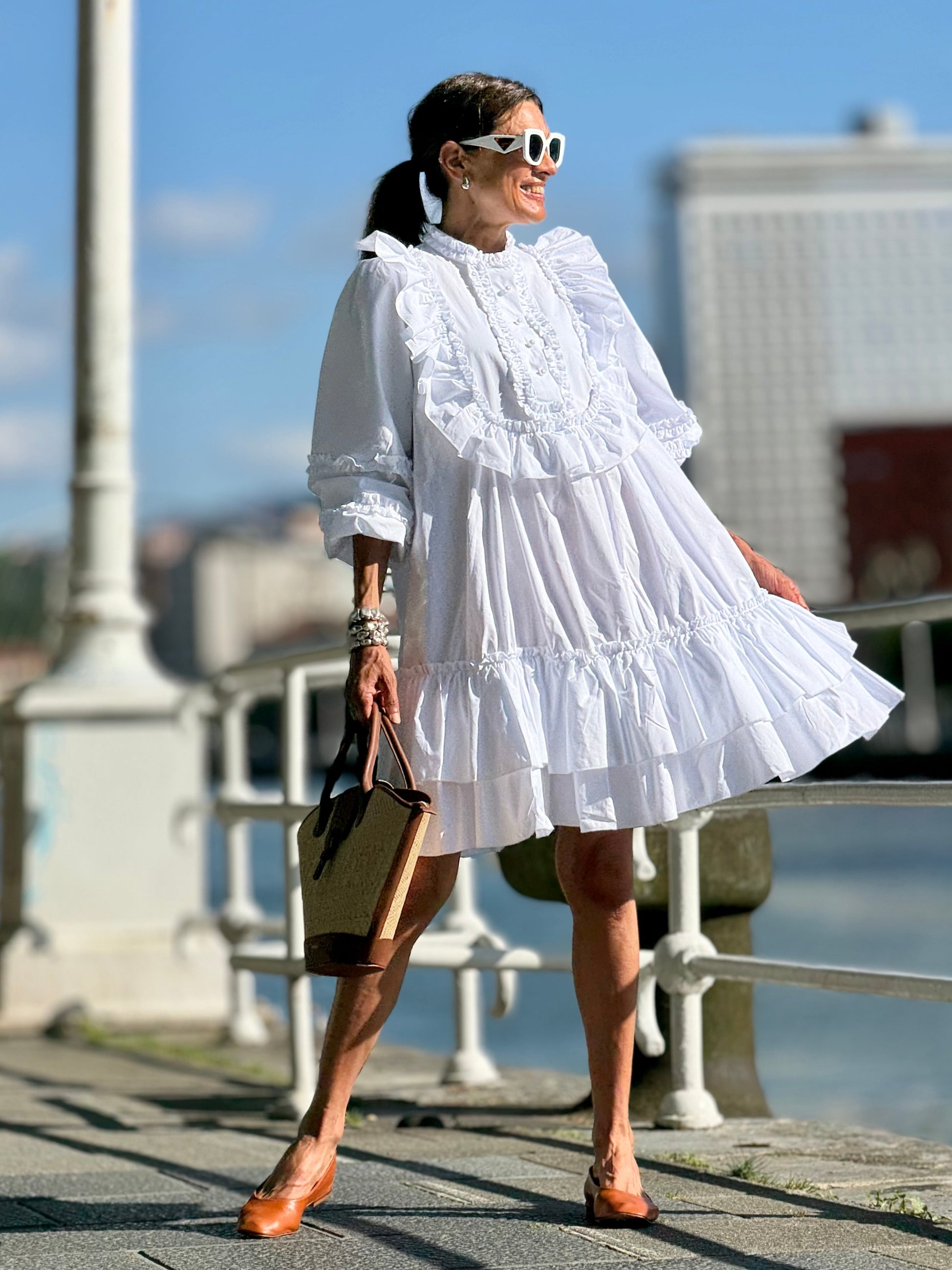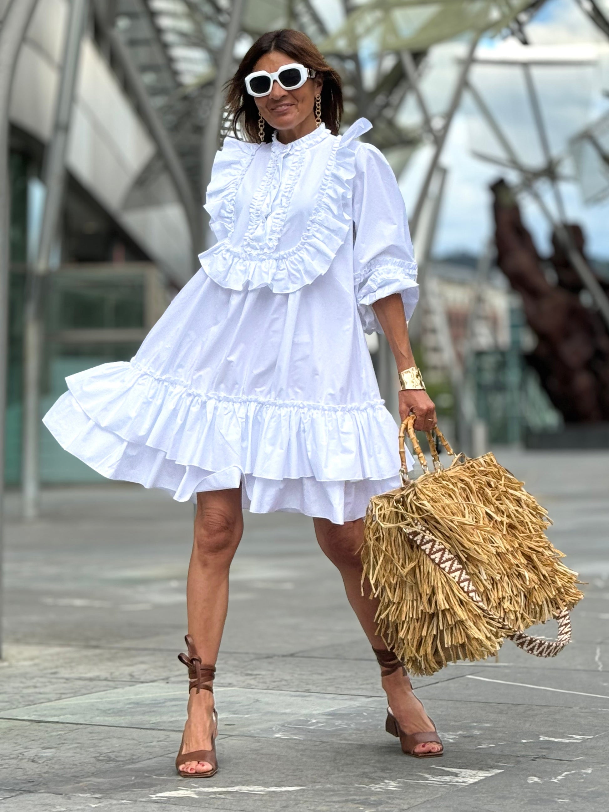 Discover the elegance of Dress Marie White, crafted from luxurious Egyptian cotton for a timelessly chic look. Delicately sculpted with white ruffles and a contemporary silhouette, this dress is the perfect choice for any special occasion. Dress Marie White is made from 100% Egyptian cotton. With a one size fits all design, this dress is suitable for a range of sizes from 34 to 42 in the German size system (see: tab sizes). Measuring a length of 96 cm. Use machine washes at 30 degrees for easy care and maintenance. The dress is not see through.