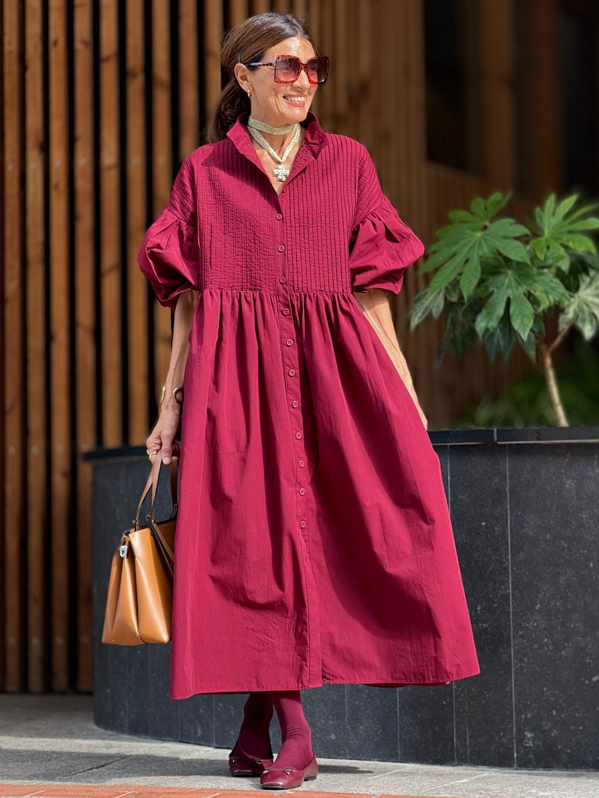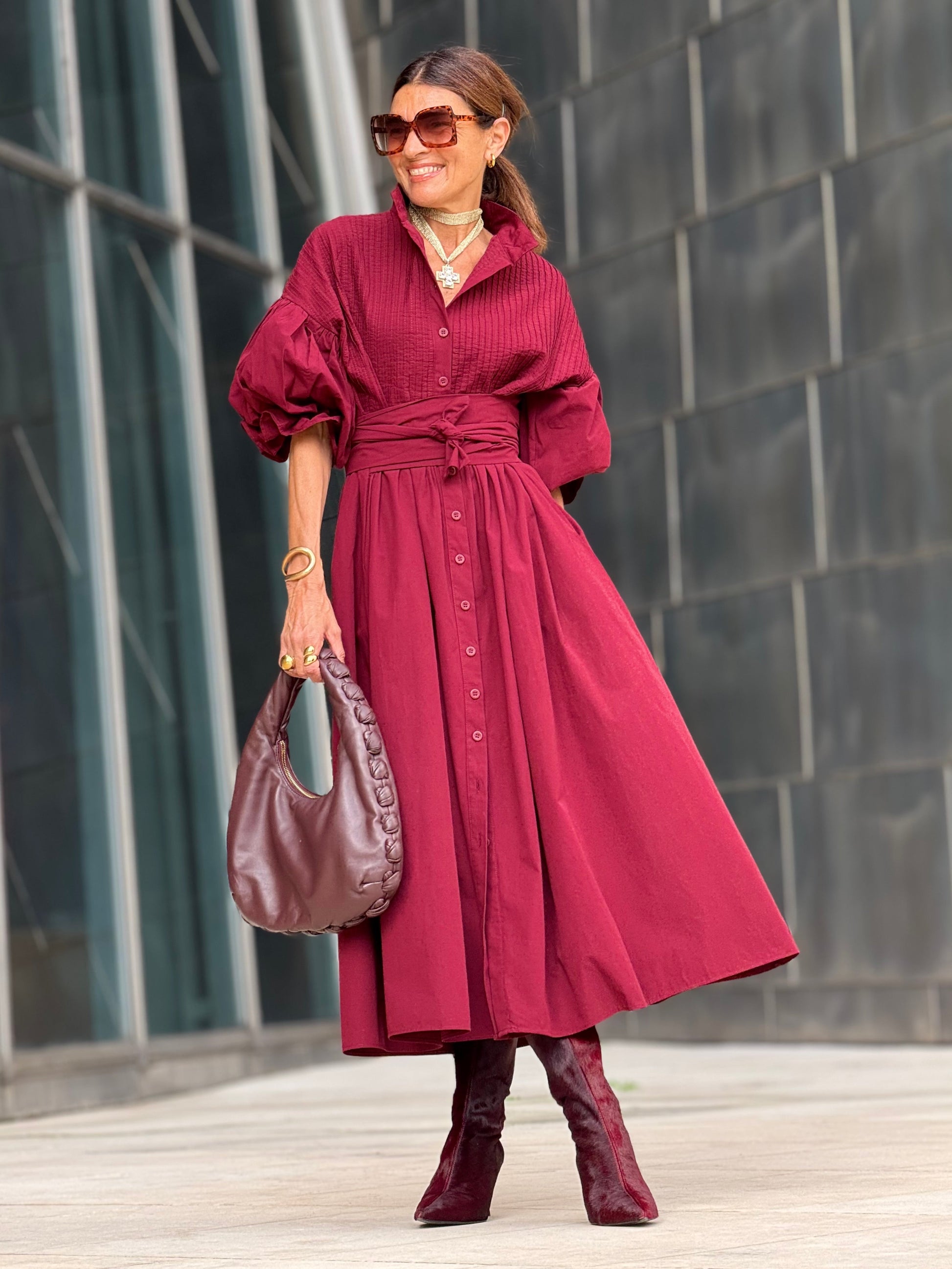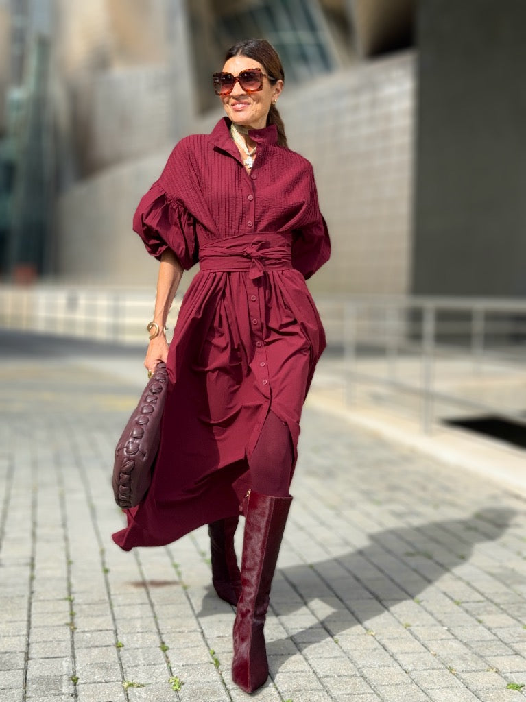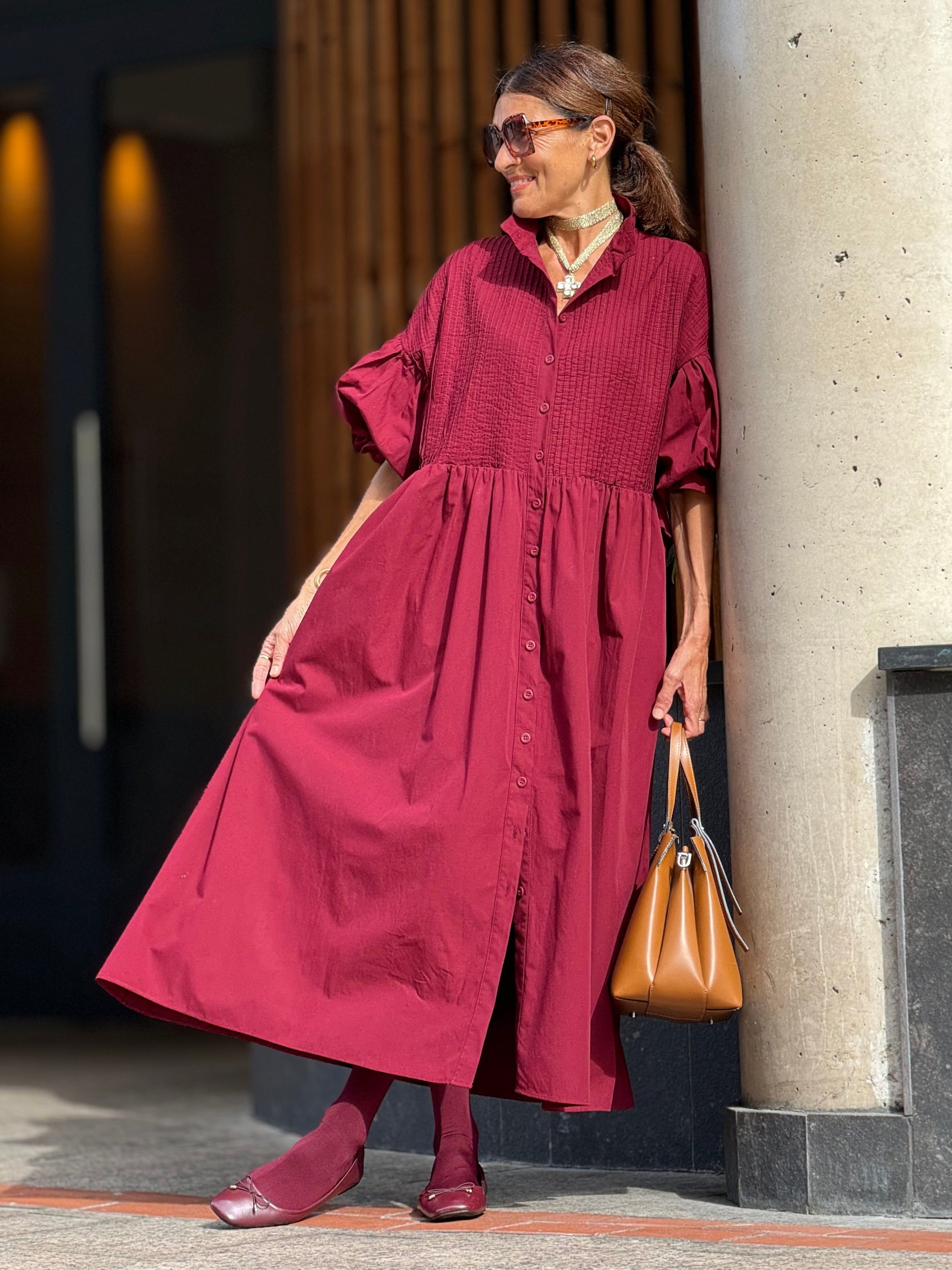 The Dress Phoebe Burgundy is a stylish and comfortable garment made from 100% Egyptian cotton. With a one size fits all design, this dress is suitable for a range of sizes from 34 to 42 in the German size system (see: tab sizes). Measuring a length of 130 cm, this dress is perfect for any occasion. The fabric belt is attached to the dress. Use machine washes at 30 degrees for easy care and maintenance.