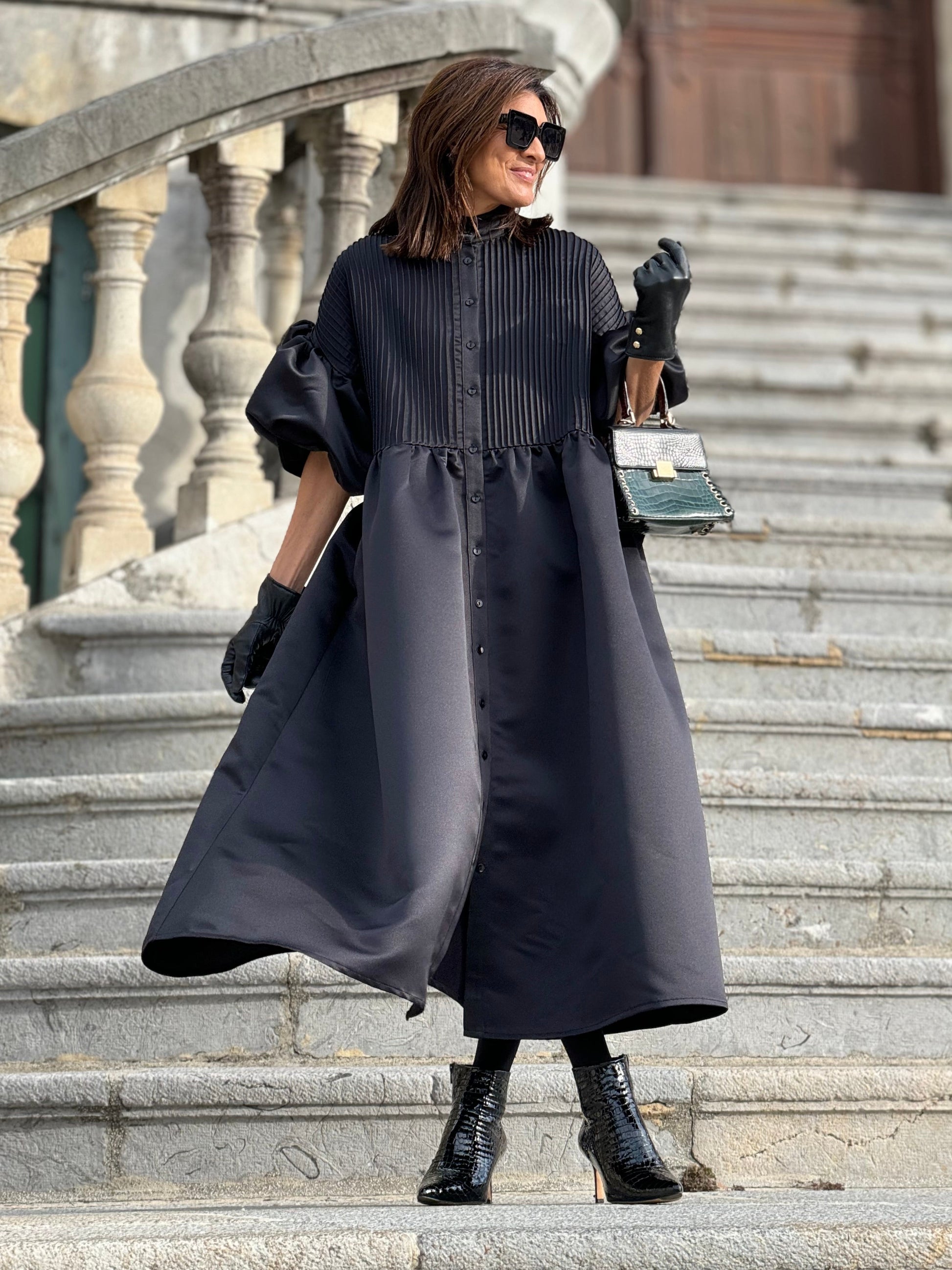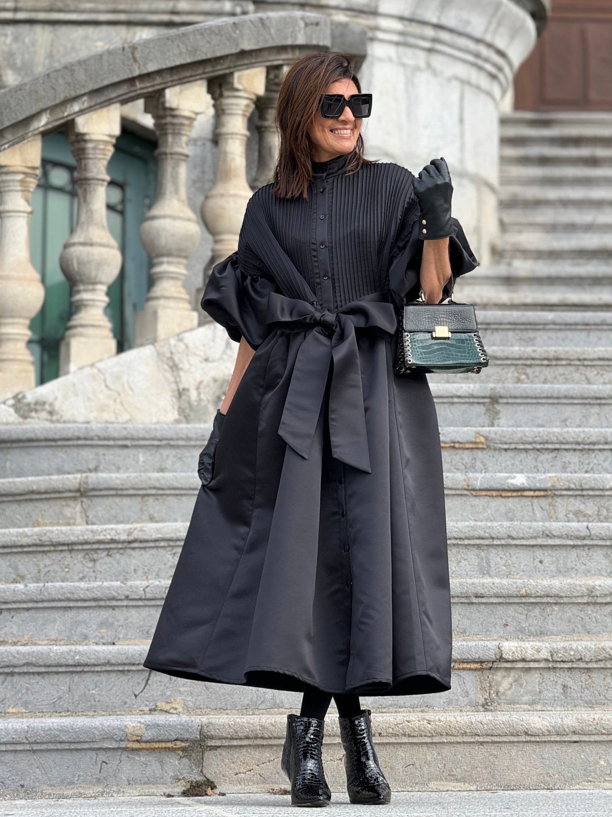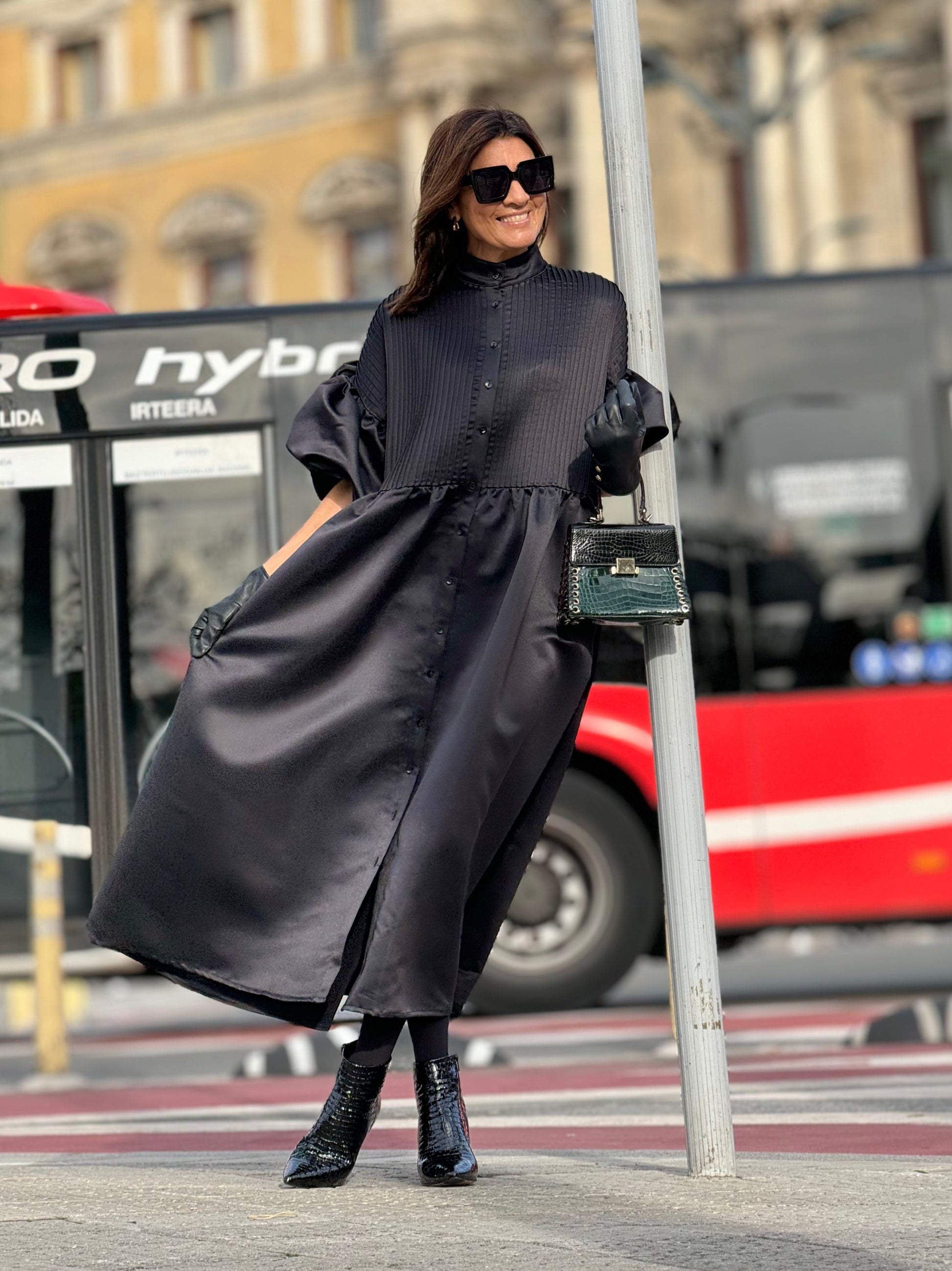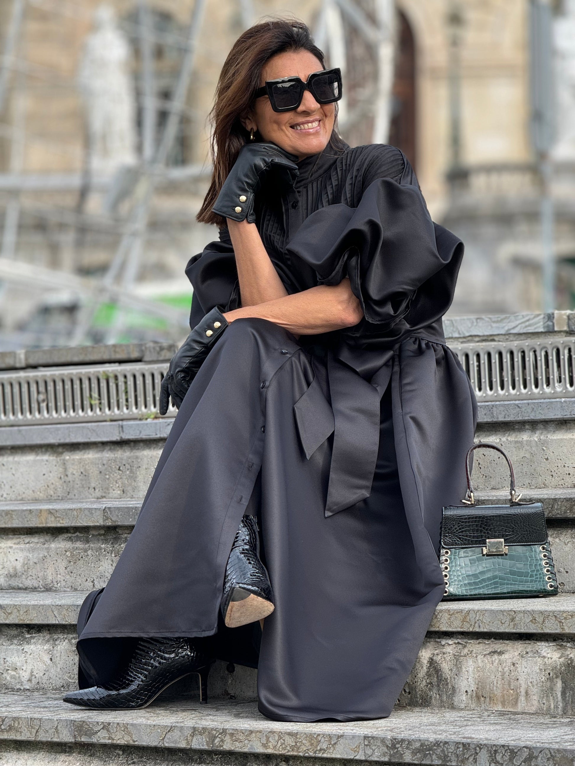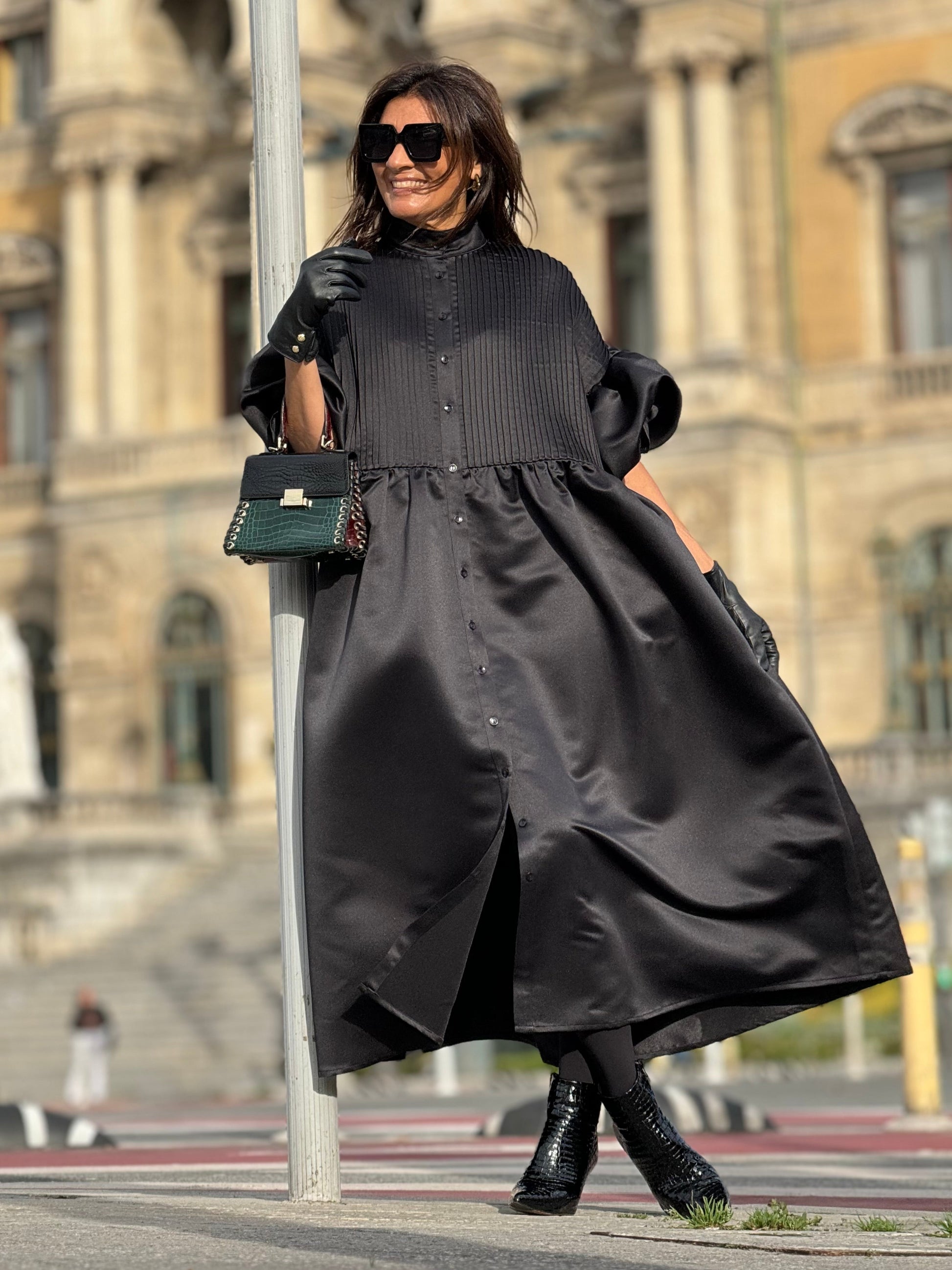 The Dress Phoebe Satin Black is a stylish and comfortable dress made of a beautiful satin fabric. With a one size fits all design, this dress is suitable for a range of sizes from 34 to 42 in the German size system (see: tab sizes). Measuring a length of 130 cm, this dress is perfect for any occasion. The fabric belt is attached to the dress. Use machine washes at 30 degrees for easy care and maintenance.