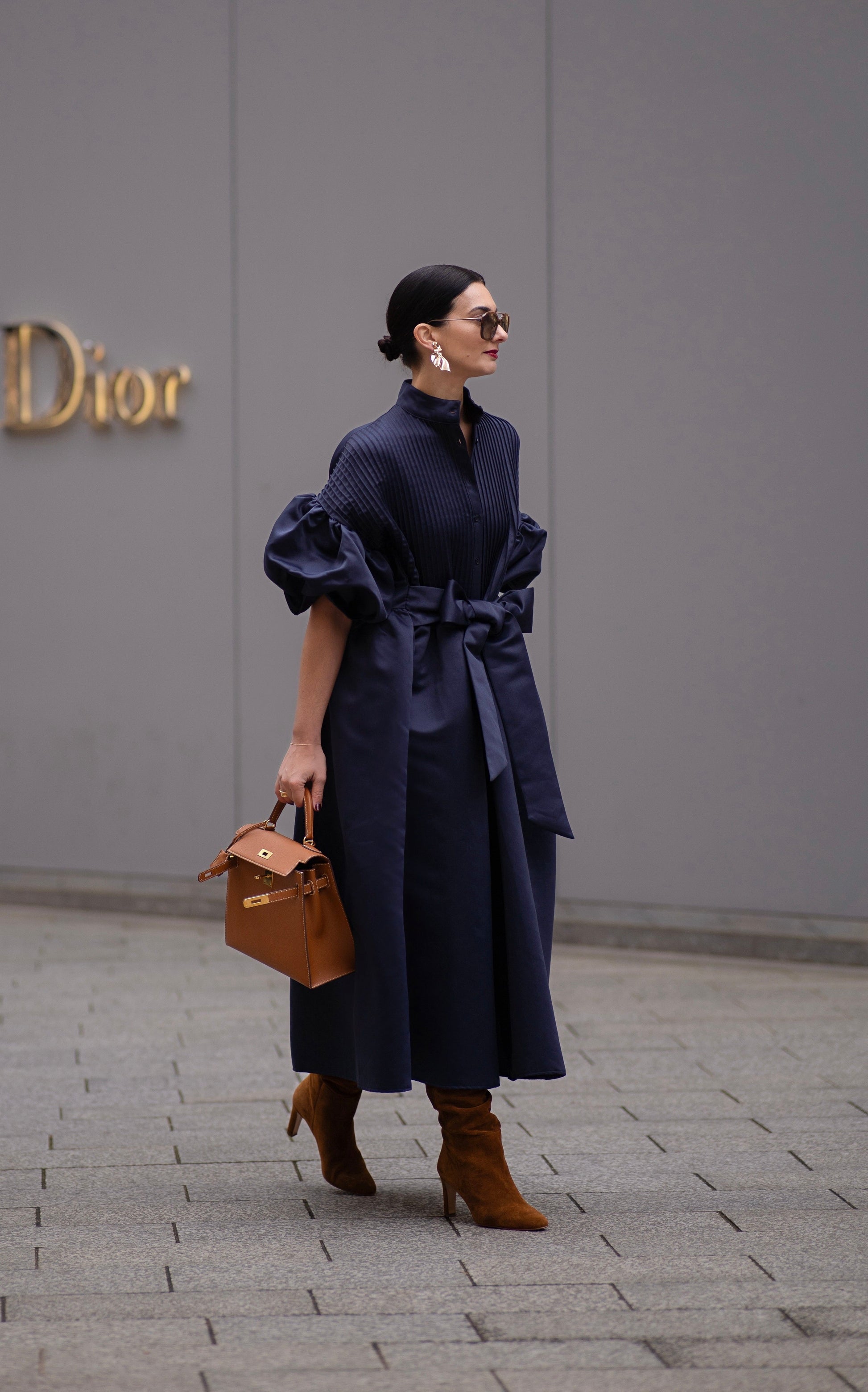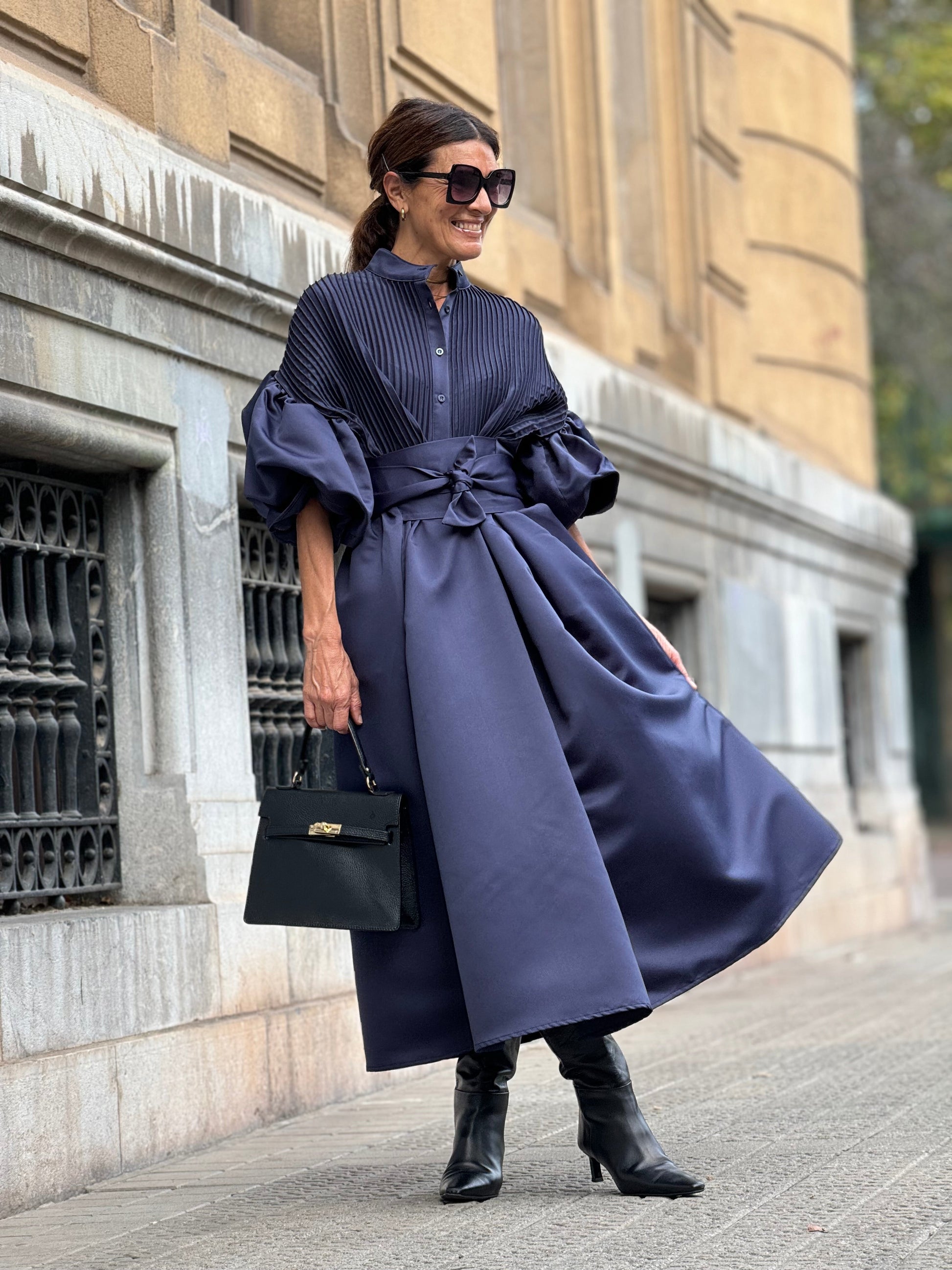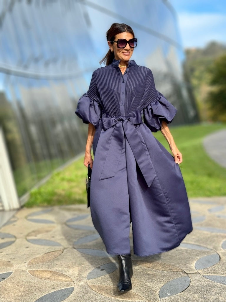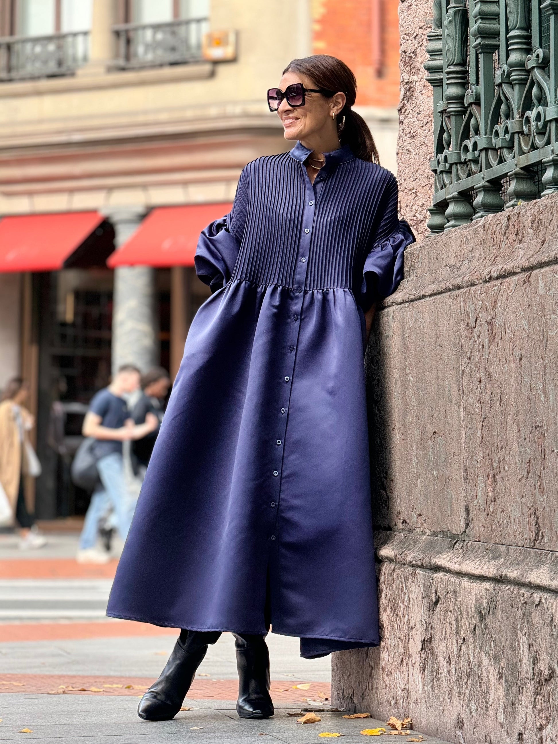 The Dress Phoebe Satin Navy is a stylish and comfortable dress made of a beautiful satin fabric. With a one size fits all design, this dress is suitable for a range of sizes from 34 to 42 in the German size system (see: tab sizes). Measuring a length of 130 cm, this dress is perfect for any occasion. The fabric belt is attached to the dress. Use machine washes at 30 degrees for easy care and maintenance.