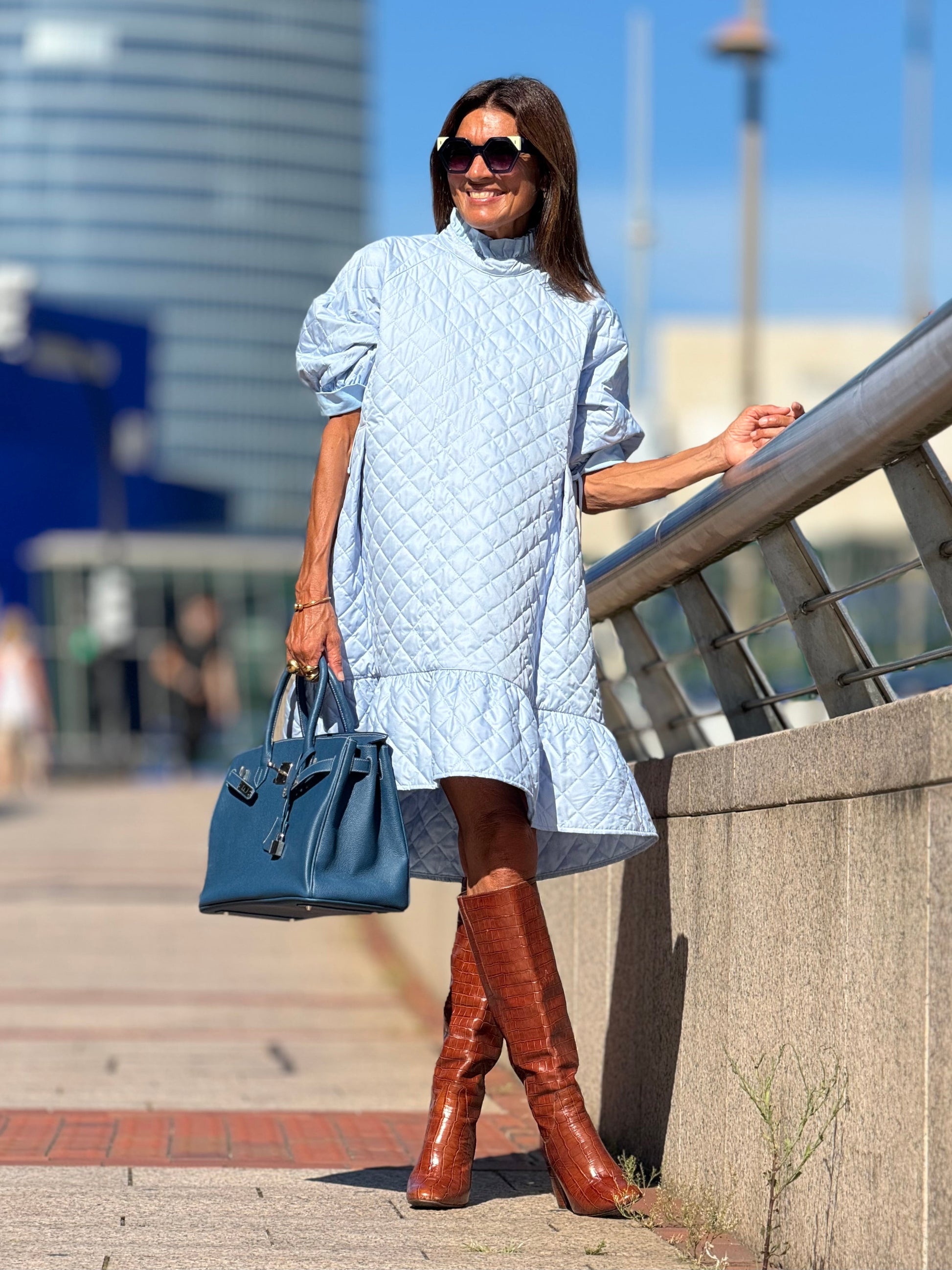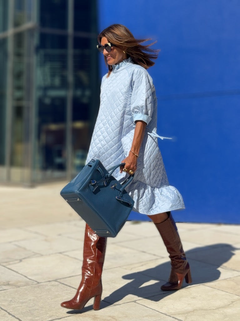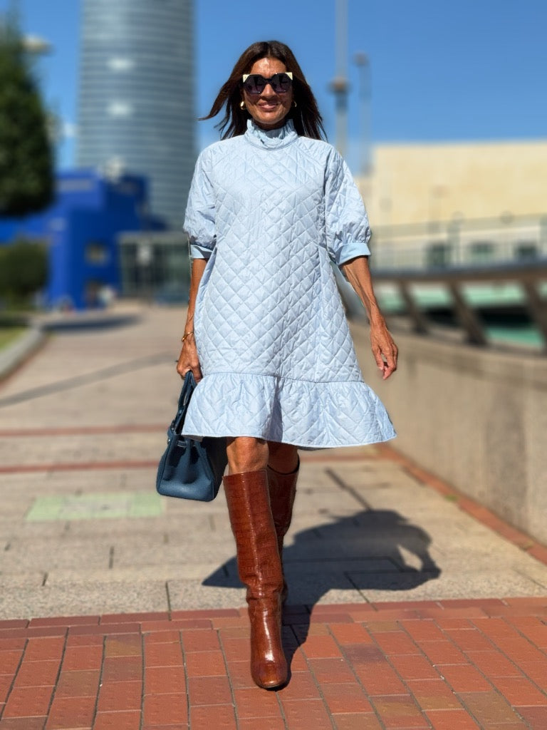 The Dress Sarah Light Blue features quilted fabric, bringing a classic and stylish look to any wardrobe. The quilted fabric is designed to be comfortable and stylish in any setting. With this dress, you'll be guaranteed to turn heads. The length is 90 cm/2.95 ft.