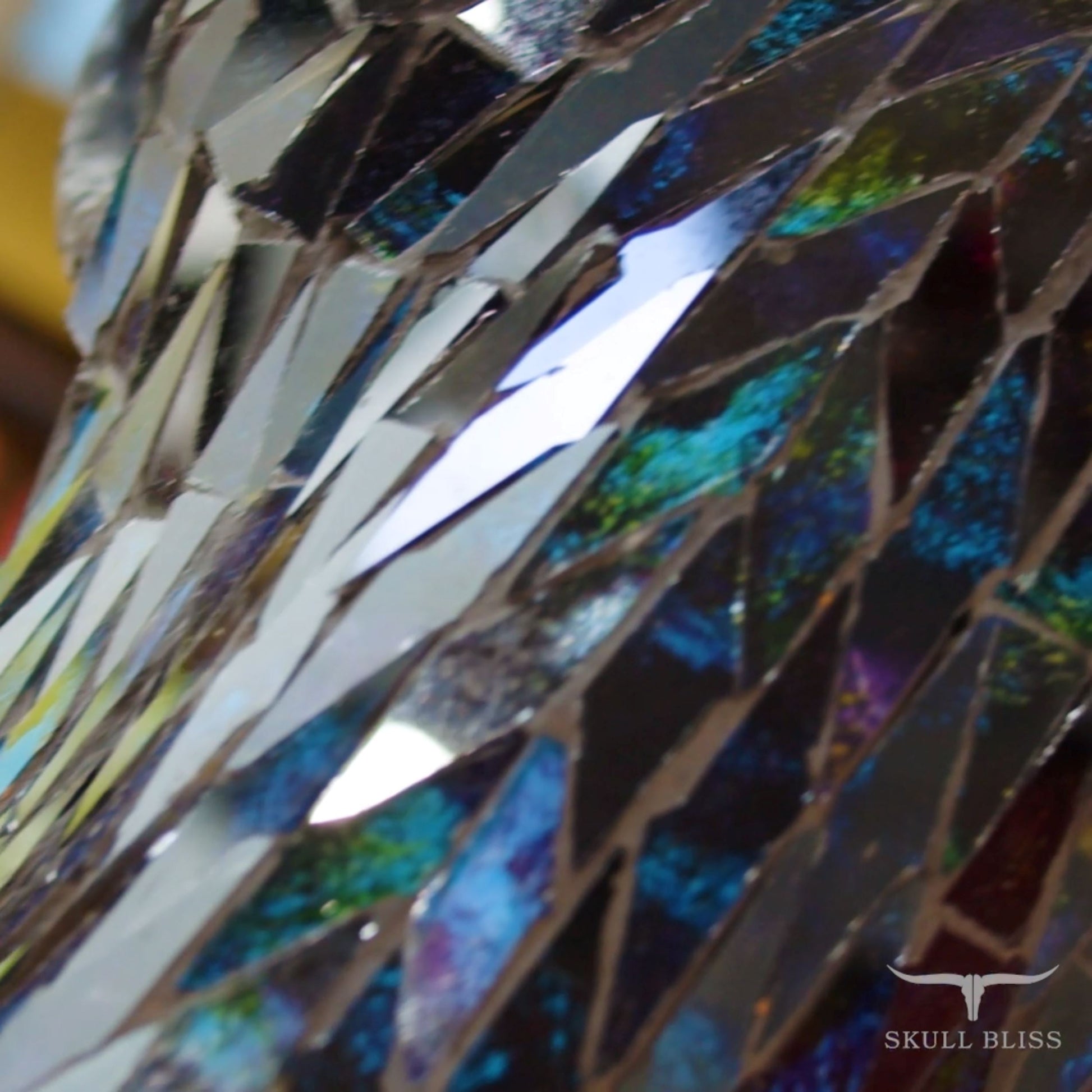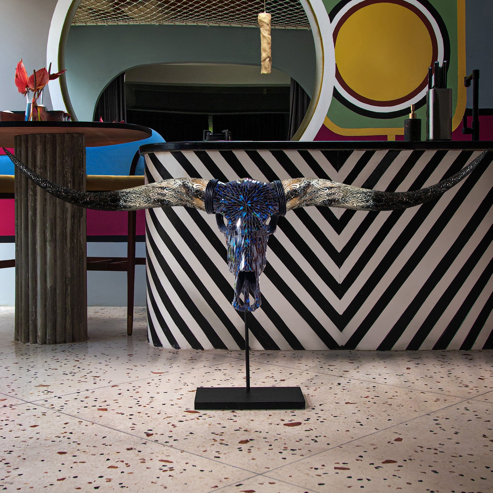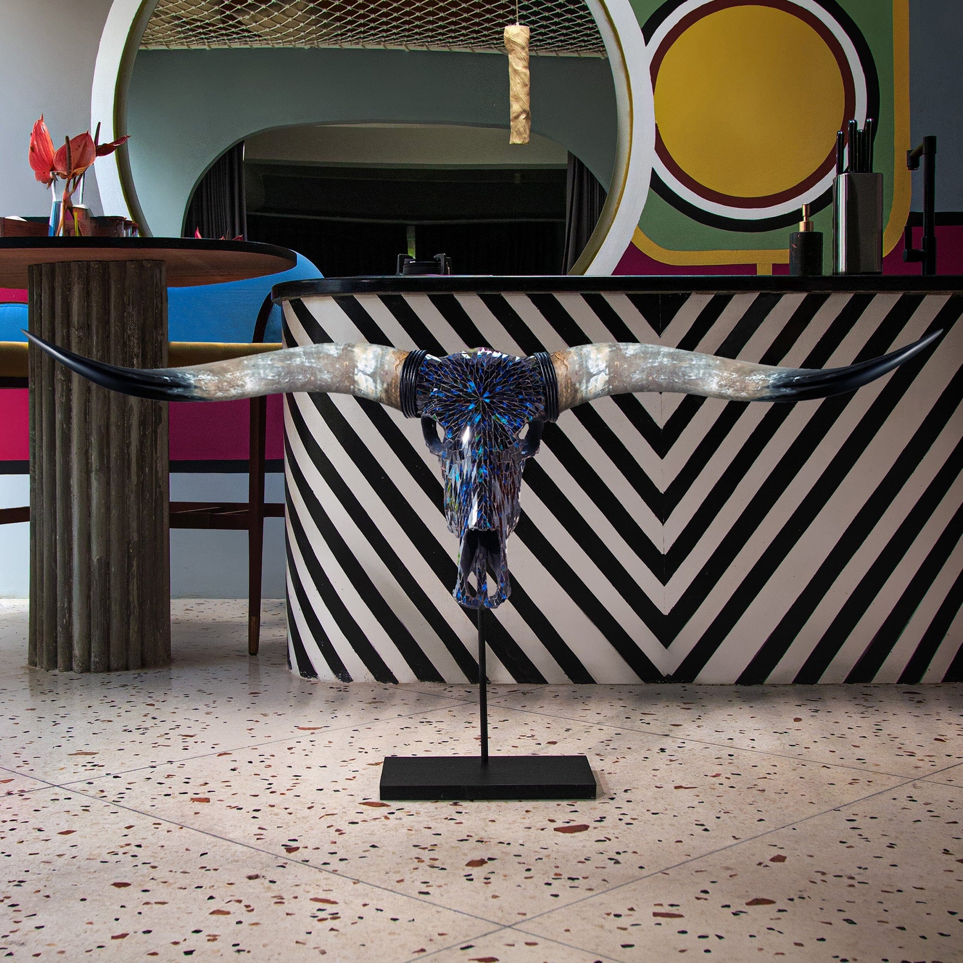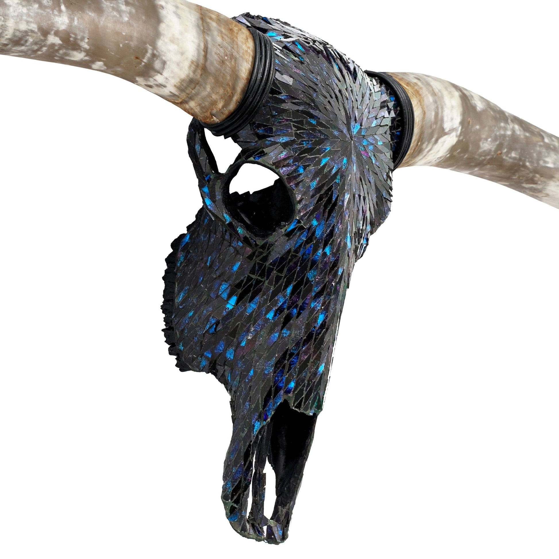 Embrace the element of chance with our mesmerizing Longhorn Skull - Blue Mirror // Mosaic Finish. This jaw-dropping home decor blends both the organic influence of natural skulls with the modern allure of blue mosaic. This is a premium piece like no other.