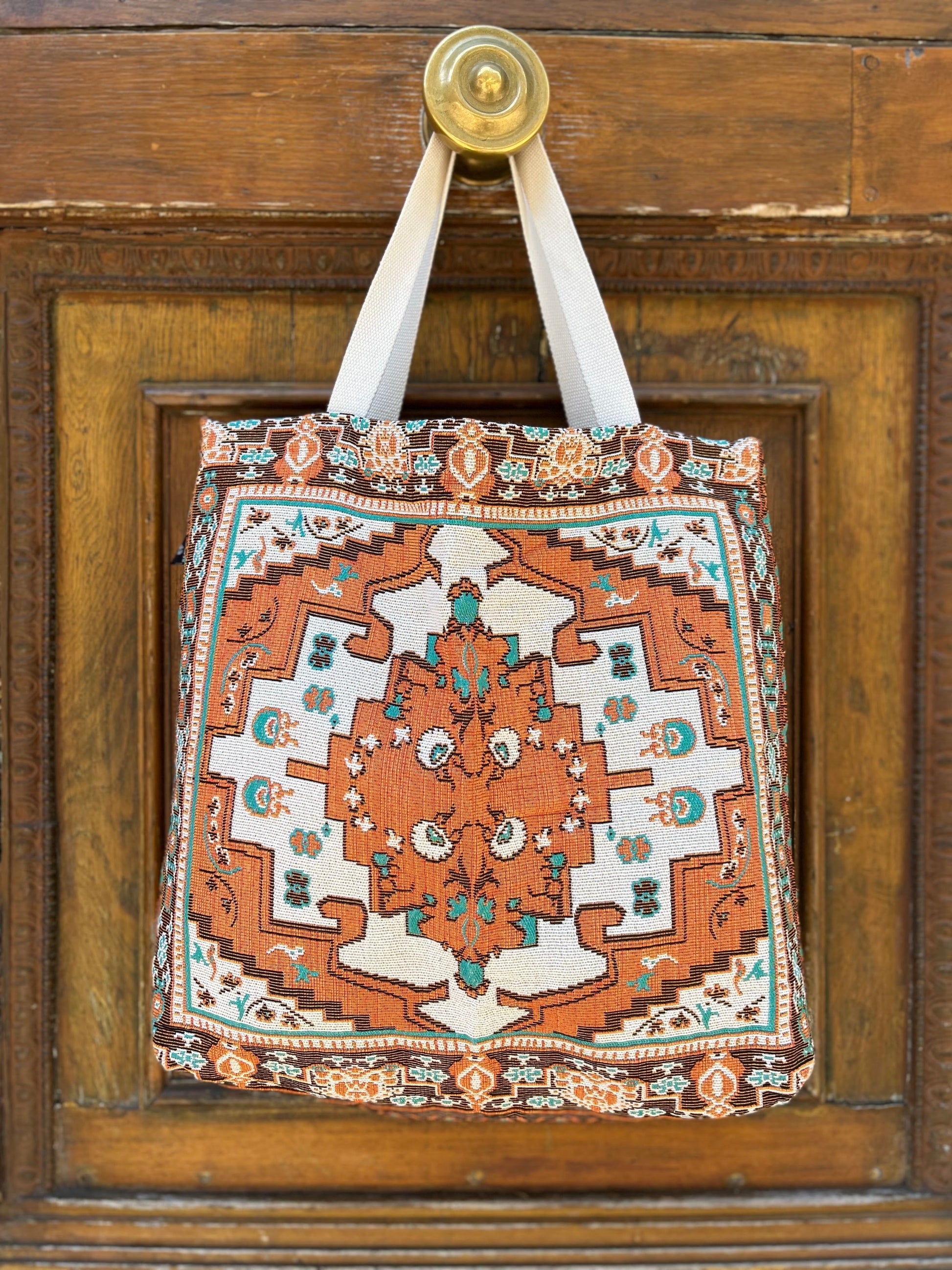 Our Norwegian Wood tote bag features sophisticated boho intricacy in brown, clay, and taupe with turquoise accents. Delicate yet eclectic, this tote will bring second glances your way each time you wear it.