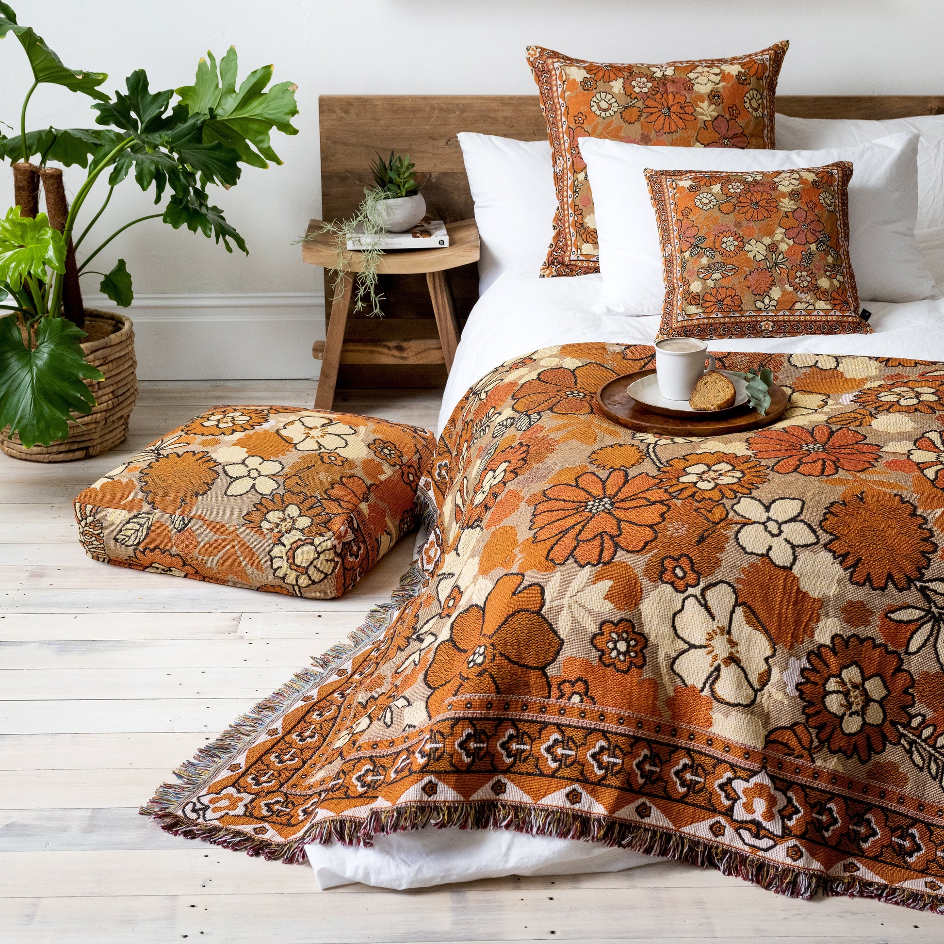 It is a light-weight throw that is thoughtfully woven using a blend of cotton and recycled polyester (sourced from plastic bottles and waste diverted from landfill and our oceans) ... to create an intricate bohemian, floral & retro design.
